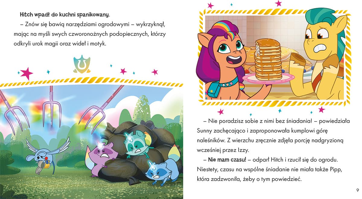 Przenieś się do Zatoki Grzyw i dołącz do swych ulubionych bohaterów – Sunny Starscout oraz pozostałych kucyków. Przeczytaj o wyjątkowej szkole latania, przekonaj się, kto wcieli się tam w rolę nauczycielki i czy jeden dzień zajęć wystarczy, aby zamienić grupkę początkujących lotników w podniebnych akrobatów. Dotrzymaj towarzystwa Sunny i Izzy podczas ich górskiej eskapady i odkryj tajemnicę zaginionych okularów słonecznych Zipp. Te trzy proste, ciepłe i pełne humoru opowieści ze świata kucyków ukołyszą malucha do snu, a świecąca w ciemności okładka sprawi, że rytuał wspólnej wieczornej lektury nabierze wyjątkowej aury! Aby podziwiać efekt świecenia, wystarczy naświetlić okładkę książki pod lampą lub zostawić ją na chwilę w jasnym pomieszczeniu. Lakier użyty na okładce jest w pełni bezpieczny dla dzieci, a dzięki zaokrąglonym rogom książka nadaje się nawet dla kilkulatków. W zbiorze znalazły się niepublikowane wcześniej opowieści napisane na podstawie odcinków serialu „MLP. Opowiedz swoją historię”: „Górska kolacja”, „Szkoła latania” i „Skradzione okulary”.Szczegółowe informacje na temat książki My Little Pony. Nowe pokolenie. 3 bajeczki przed snem