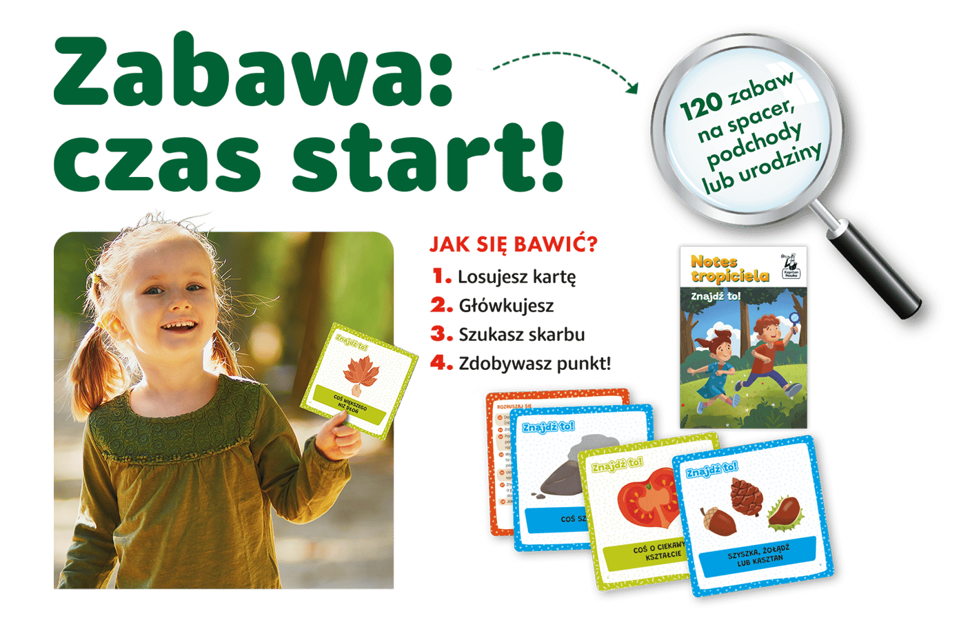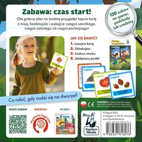 Znajdź to! Na dworze to zestaw 120 zabaw, które idealnie sprawdzą się w plenerze – na spacerze, pikniku, przyjęciu urodzinowym czy w grze w podchody. Dzięki nim dzieci spędzą wartościowy czas na świeżym powietrzu, a przy okazji rozwiną kreatywność i myślenie logiczne.