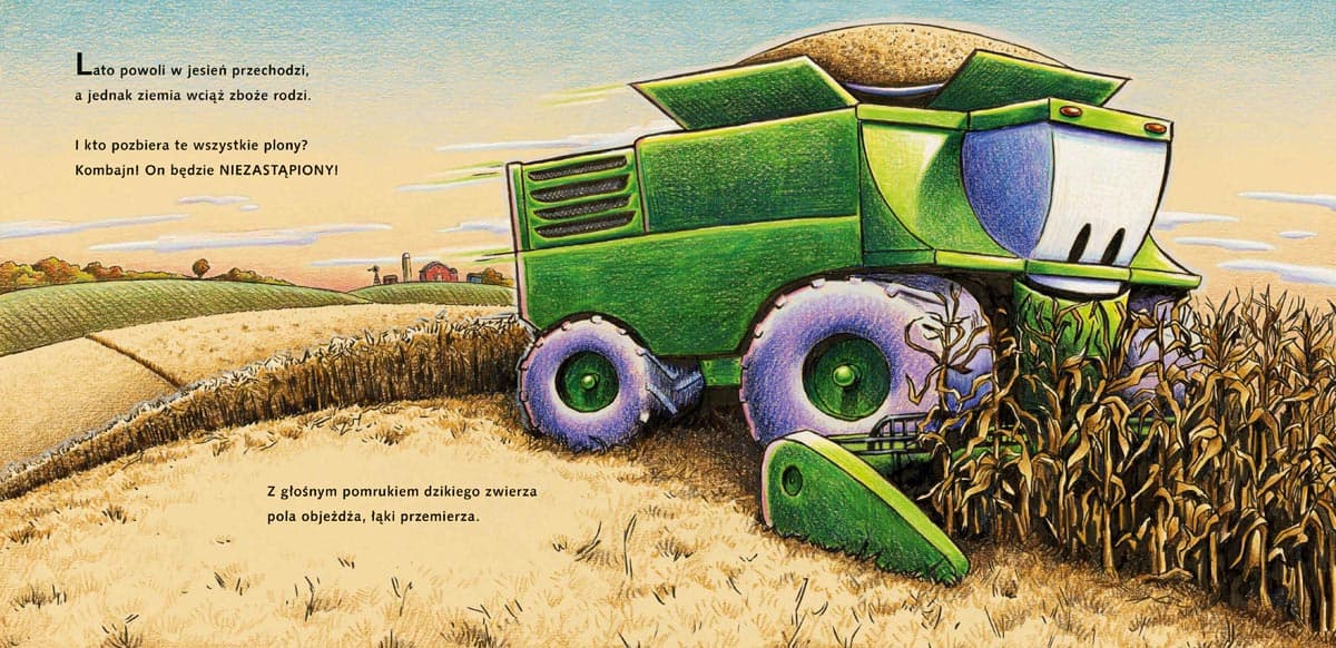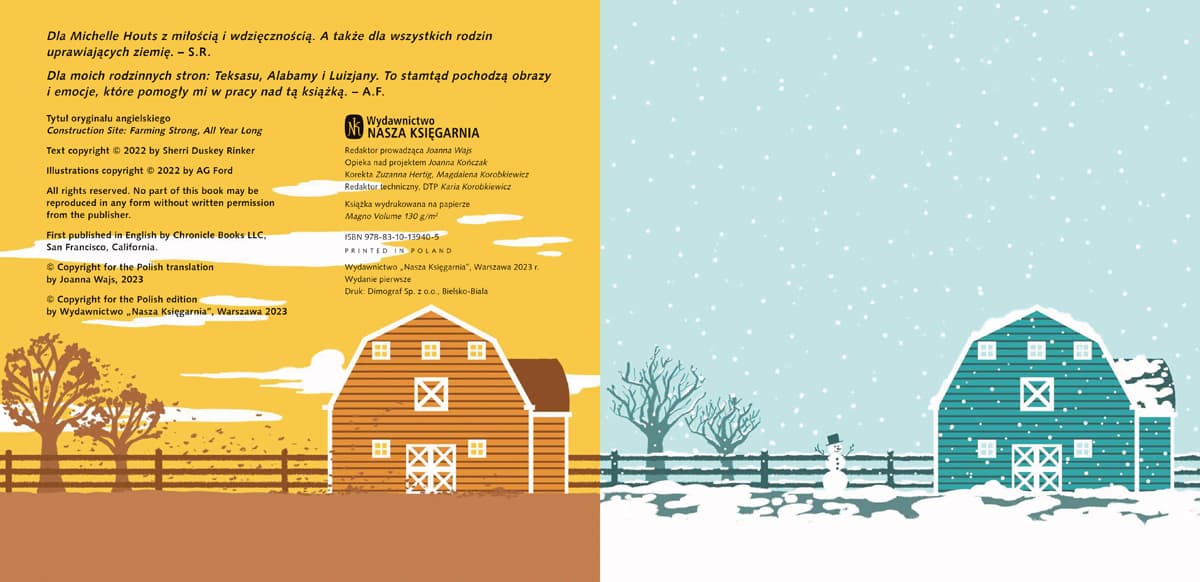Kontynuacja książeczki na dobranoc, którą pokochały dzieci na całym świecie! Koparka, wywrotka, betoniarka, dźwig, spychacz i miniładowarka Brumka powracają! Tym razem jadą na wieś, gdzie spędzą cały rok. Będą tam pomagać maszynom rolniczym – takim jak traktor czy kombajn. Naprawią drogę podmytą przez deszcz, załatają dach, posprzątają w zagrodach, a nawet zbudują obórkę, żeby zwierzęta nie marzły w zimowe noce. Dla jednego autka to byłoby mnóstwo pracy… ale od czego są przyjaciele? Sherri Duskey Rinker zawsze chciała zostać poetką, ale zaczęła pisać dla dzieci dopiero po narodzinach synów. Pierwsza książka Sherri powstała w tydzień… chociaż później redaktorki kazały jej policzyć jeszcze raz sylaby i poprawić rytm wierszyka. Zignorowały też towarzyszące historyjce obrazki, mimo że autorka przez wiele lat pracowała jako graficzka i uważała, że umie rysować. Dziś każda kolejna opowieść o maszynach z placu budowy staje się światowym bestsellerem, lecz pisarka nadal omawia wszystkie pomysły ze swoimi dziećmi. Za jedno z najważniejszych życiowych doświadczeń uważa wspólne czytanie z nimi książek – od „Żabka i Ropucha” aż po ostatni tom Harry’ego Pottera. AG Ford jest tatą dwóch chłopców i cenionym ilustratorem książek dla najmłodszych. Rysuje niemal bez przerwy, odkąd nauczył się trzymać w dłoni kredkę, i do dziś woli techniki tradycyjne od pracy na komputerze. Zmieniło się tylko jedno: kiedy był mały, uwieczniał głównie żółwie ninja. Powyższy opis pochodzi od wydawcy.
