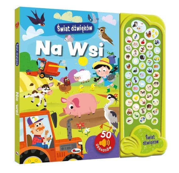 Książka zabiera małych czytelników w niezapomnianą PODRÓŻ DO GOSPODARSTWA WIEJSKIEGO. Dzieci znajdą w niej mnóstwo ZWIERZĄT przedstawionych w środowisku wiejskim. Wyróżnikiem publikacji jest aż 50 różnorodnych DŹWIĘKÓW. Dzięki niej maluch dowie się, jakie dźwięki wydają kaczka, koń, komar, pasikonik czy traktor. Przyjazne ILUSTRACJE charakteryzują się ŻYWĄ KOLORYSTYKĄ.