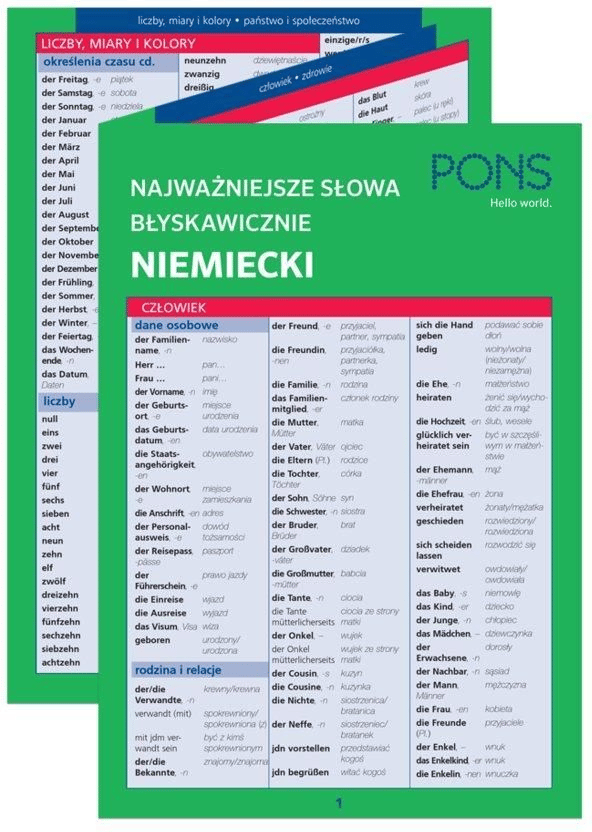 Język w pigułce ? najważniejsze słowa z języka na 12 laminowanych stronach formatu A5, które możesz wpiąć w segregator lub włożyć do zeszytu lub podręcznika. Przydatne w podróży, przy nauce języka na kursie, szkole lub jako materiał pomocniczy do samodzielniej nauki języka. Zawiera podstawowe słownictwo z 16 obszarów tematycznych od przedstawiania się po liczby i jednostki miar.