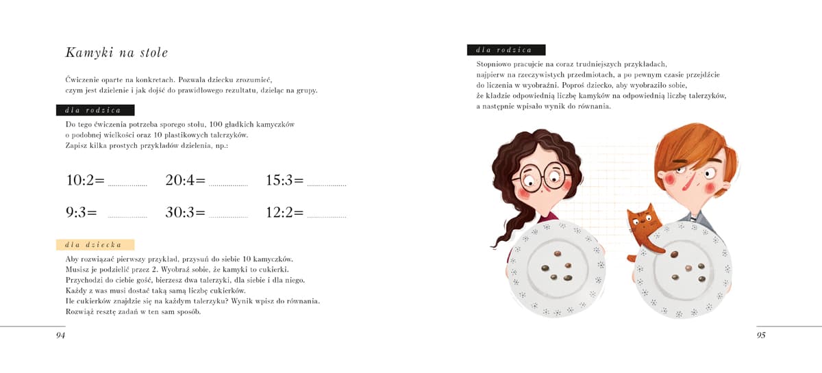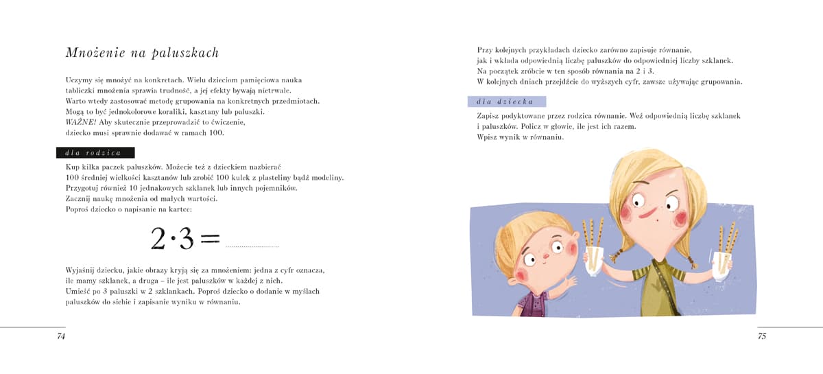 Specjalna konstrukcja i forma książki pomagają skupić się na konkretnym zagadnieniu. Całość jest podzielona na 5 części: dodawanie, odejmowanie, mnożenie, dzielenie i różności matematyczne, w których dziecko oswaja się z ułamkami, odczytywaniem godziny na zegarze, a także szacowaniem długości.