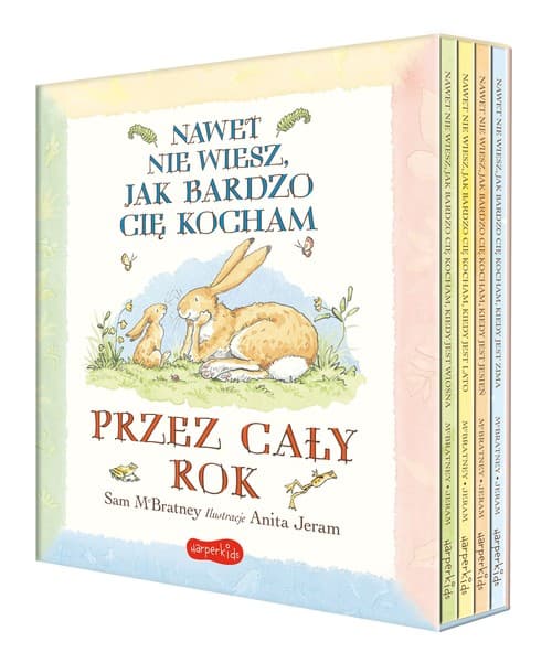 Niezwykła kolekcja czterech uroczych historii na każdą porę roku w pięknym, prezentowym etui. W pudełku znajdują się wydane wcześniej osobno książki bestsellerowych autorów Sama McBratneya i Anity Jeram: Nawet nie wiesz, jak bardzo cię kocham, kiedy jest wiosna, Nawet nie wiesz, jak bardzo cię kocham, kiedy jest lato, Nawet nie wiesz, jak bardzo cię kocham, kiedy jest jesień, Nawet nie wiesz, jak bardzo cię kocham, kiedy jest zima. Gdy wiosną wszystko dookoła rośnie i zmienia się z dnia na dzień, w głowie Małego Brązowego Zajączka kiełkują ważne pytania. Czy on też się zmieni? A jeśli tak, to na czym ta zmiana będzie polegała? Latem Zajączek nie może się nacieszyć słońcem i wszechobecnymi kolorami, choć tylko jeden z nich to jego ulubiony. Jesienią nasz bohater uwielbia harcować wśród podmuchów wiatru, a zimą bawić się na śniegu z przyjaciółmi! Te zabawne i ujmujące opowieści, do których można wracać bez końca, zachwycą nie tylko fanów serii Nawet nie wiesz, jak bardzo cię kocham!