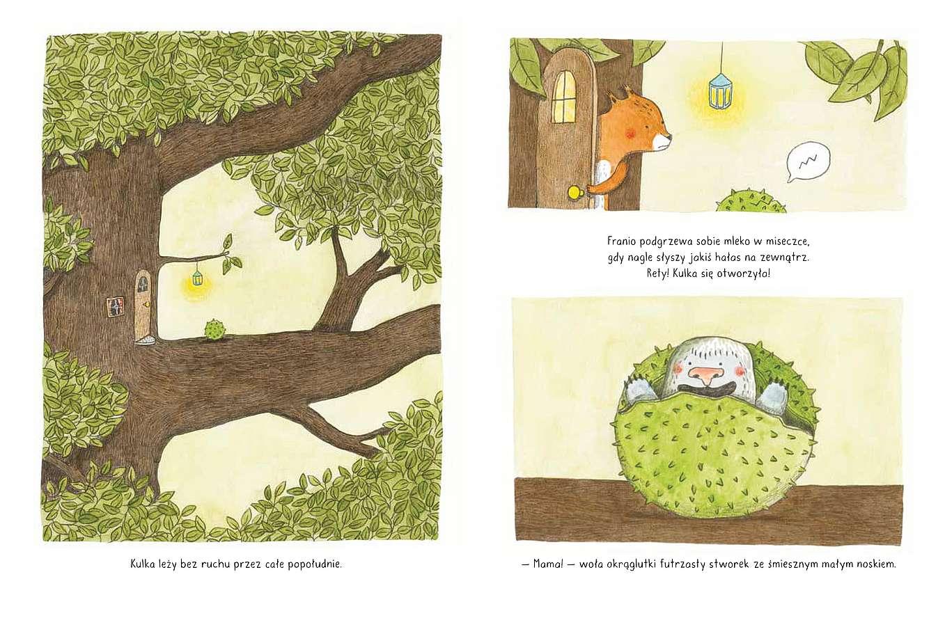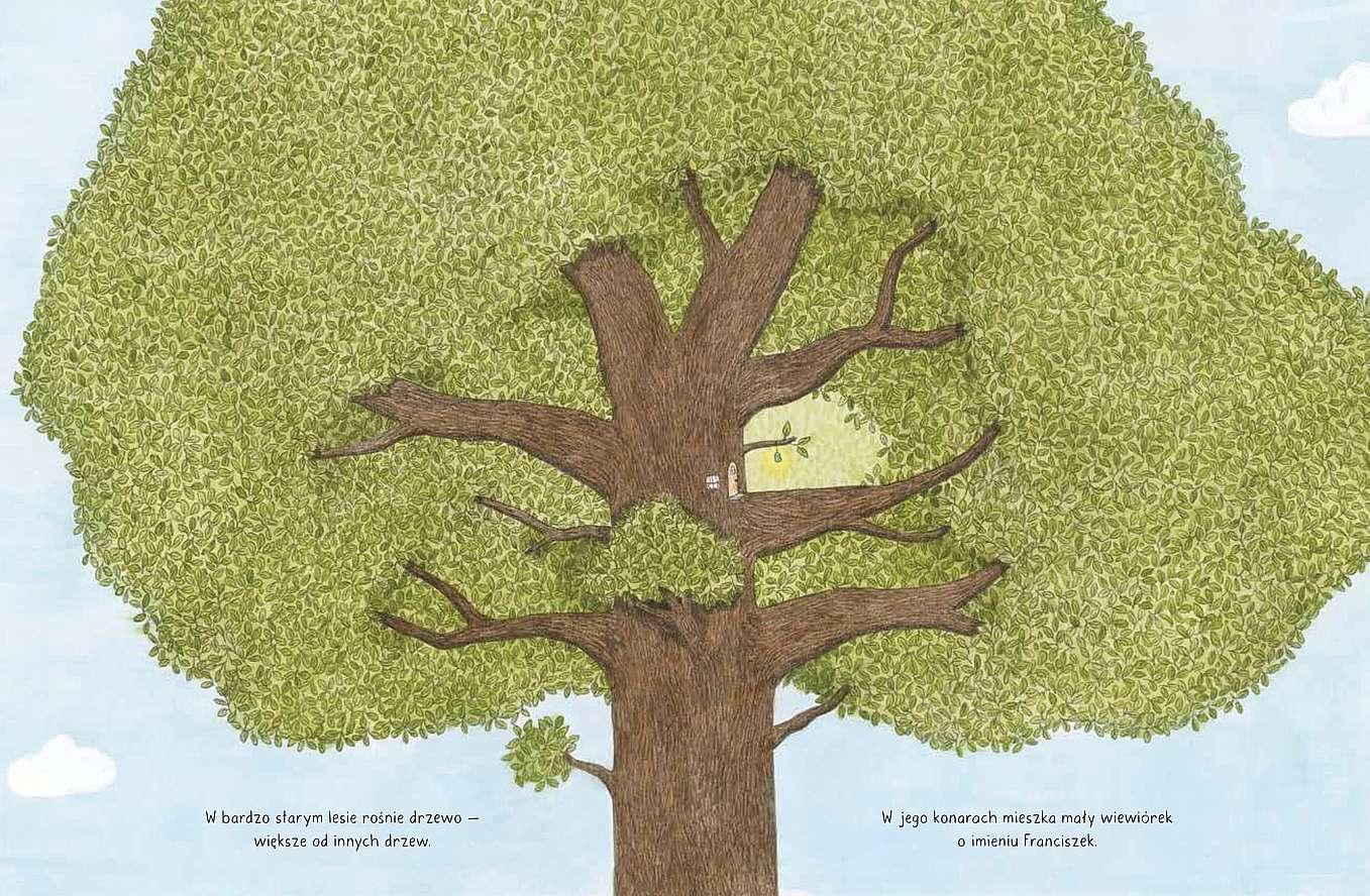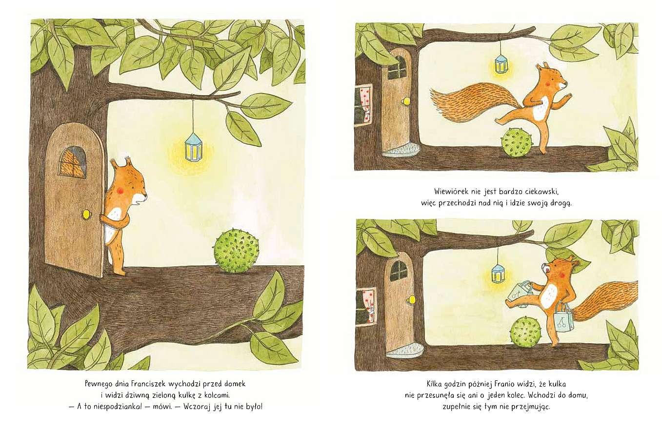 W bardzo starym lesie rośnie drzewo, większe od innych drzew. W jego konarach mieszka Franciszek, spokojny i ostrożny wiewiórek. Pewnego dnia odkrywa przed swoim domem dziwną zieloną kulkę z kolcami. Życie wiewiórka bardzo się zmienia, gdy z kulki wyskakuje biały, futrzasty stworek krzycząc do niego “Mama!”. Zdezorientowany Franciszek zaprasza go do swojego domu i obiecuje odnaleźć mamę malucha. Poszukiwania w lesie trwają, a tymczasem mały futrzak z każdym dniem jest coraz większy i wnosi w życie wiewiórka sporo zamieszania. Zabawna, pełna ciepła opowieść o wzajemnym szacunku, uważności i życiowych niespodziankach. To kolejna nasza książka kanadyjskiej autorki Marianne Dubuc w tłumaczeniu Justyny Bednarek, znanej autorki książek dla dzieci.