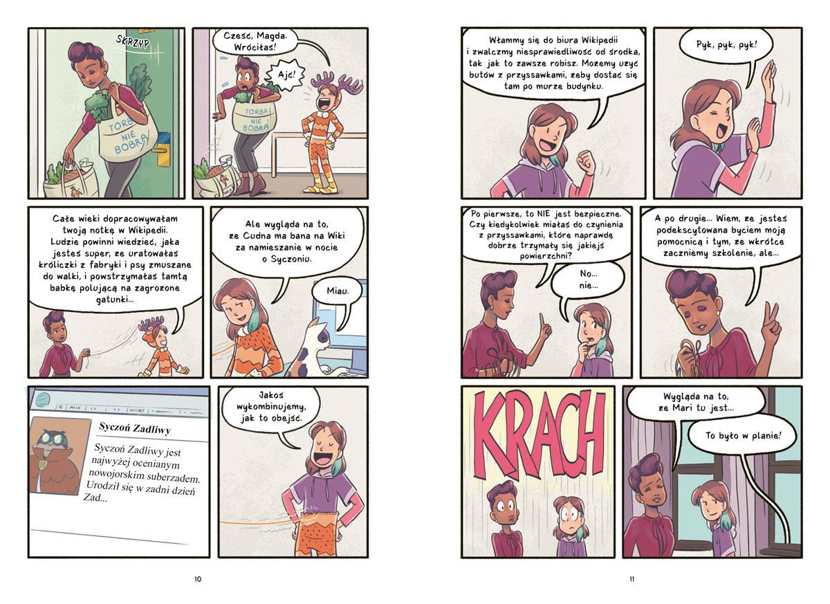 Kati uwielbia jeździć na desce z ekipą Laskółek i być pomocnicą superbohaterki. Ale kiedy zaczyna się nowy rok szkolny, sprawy przyjmują nieciekawy obrót. Ktoś podszywa się pod Myszycielkę, by popełniać straszliwe zbrodnie, Beth ma chłopaka, którego wszędzie ze sobą zabiera (brrr), a trening umiejętności potrzebnych podczas śmiałych akcji nie idzie tak, jak Kati by oczekiwała. Do tego pokłóciła się z wszystkimi przyjaciółkami. Naprostowanie nieporozumień będzie cięższe od najtrudniejszych deskorolkowych sztuczek! Ale ta dziewczyna ma do pomocy 217 nie całkiem zwyczajnych kotów!