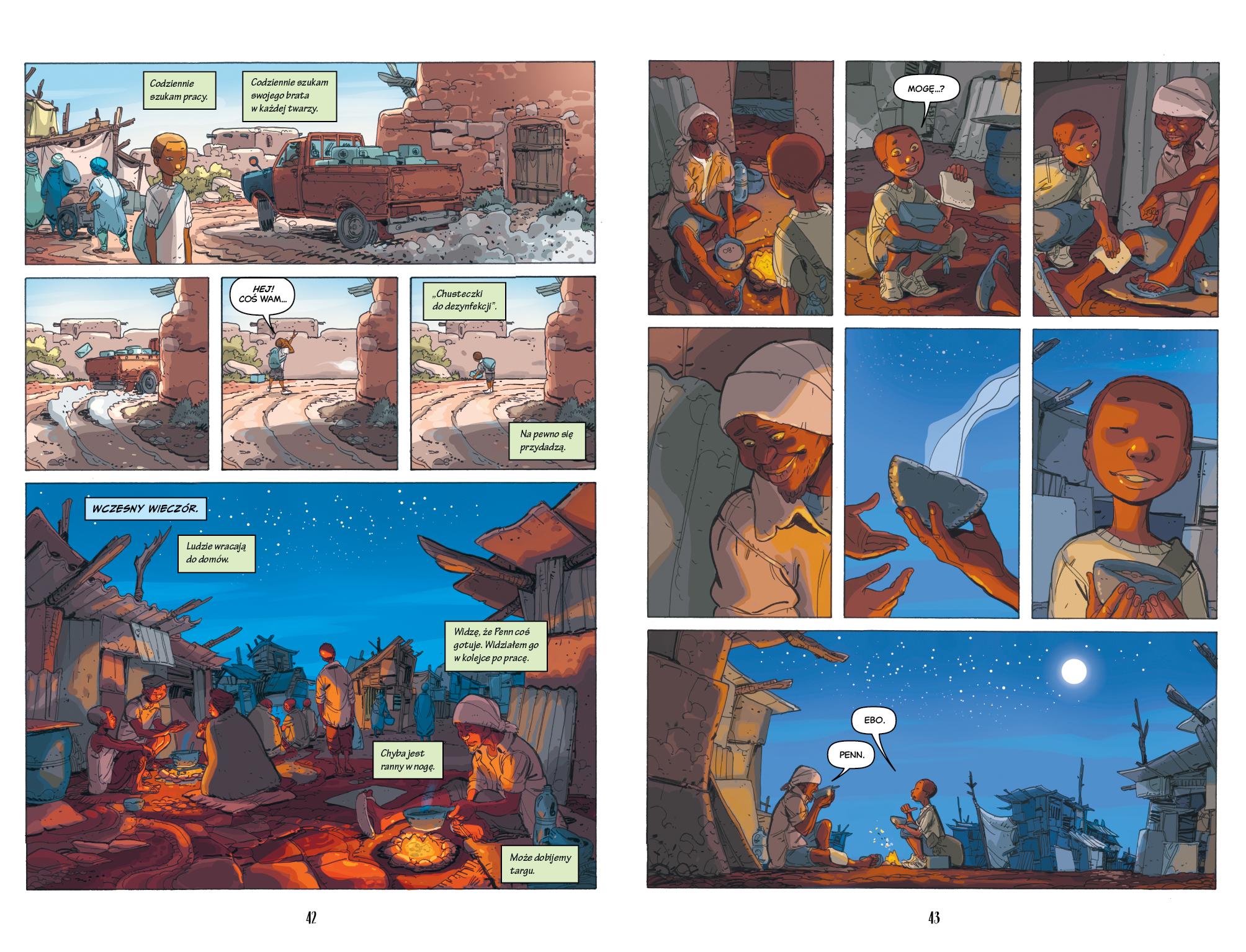 Ebo został sam. Jego siostra odeszła wiele miesięcy temu, a teraz zniknął też jego brat. Ebo domyśla się, że oboje wyruszyli w najeżoną niebezpieczeństwami podróż do Europy. Aby ich odszukać, chłopiec przemierza Saharę i niebezpieczne ulice Trypolisu, a w końcu wypływa na bezlitosne morze, ale ani na chwilę nie traci nadziei na lepsze życie. Autorzy bestsellerowej serii powieści graficznych o Artemisie Fowlu stworzyli wzruszającą i bardzo aktualną historię opowiedzianą z humorem i empatią.