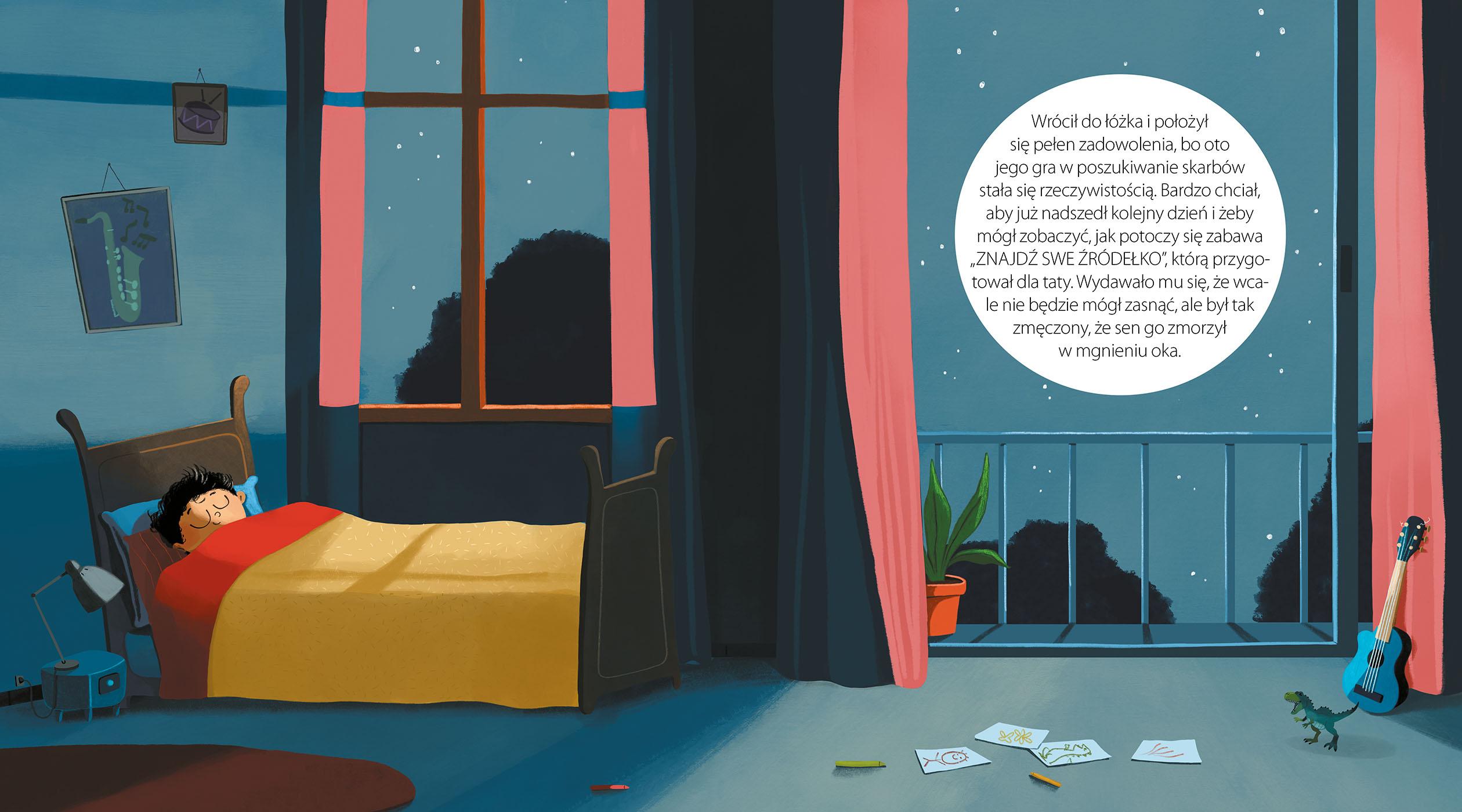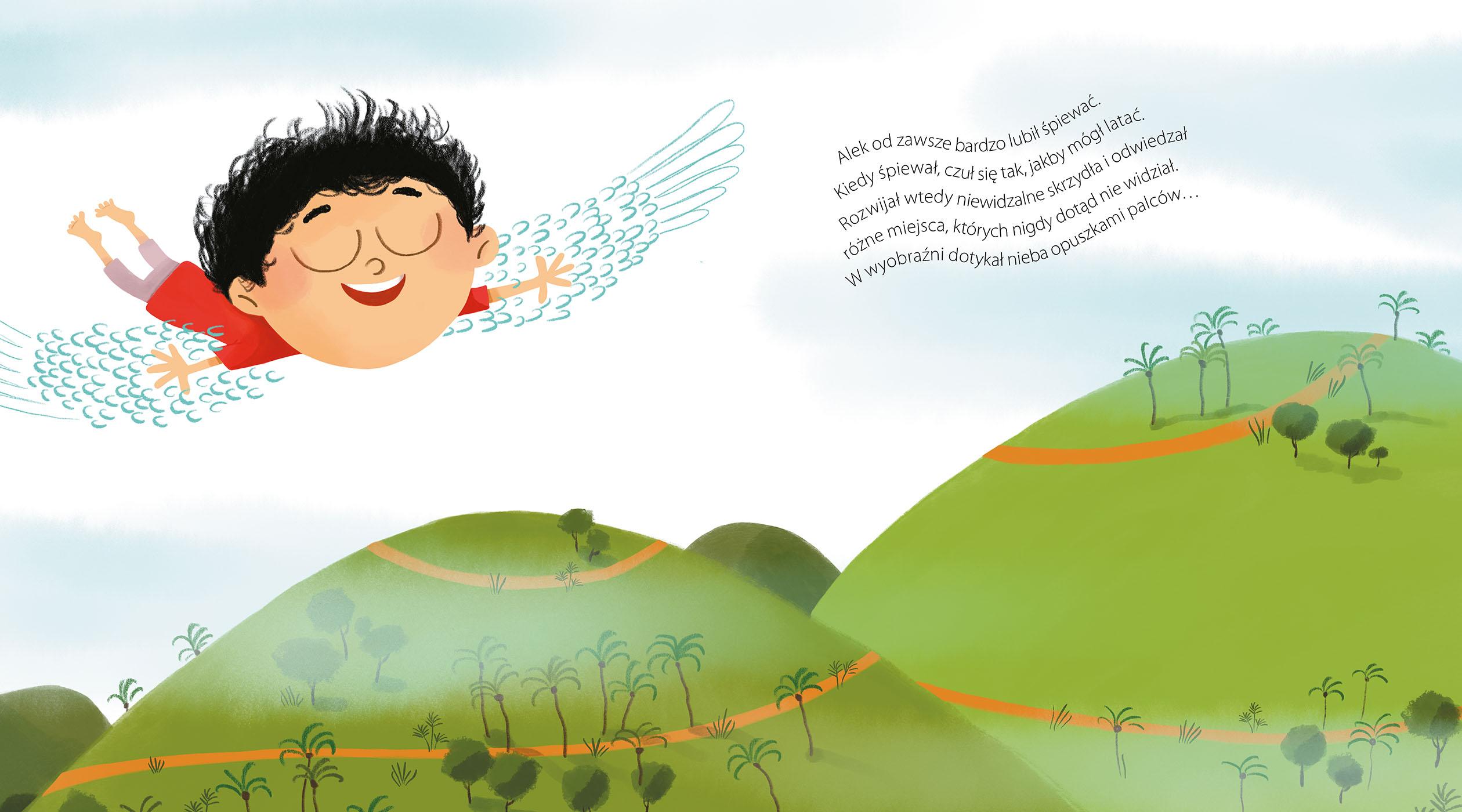 Alek bardzo lubi śpiewać. Kiedy śpiewa, czuje się tak, jakby rozwijał skrzydła i mógł latać. Odwiedza wtedy różne miejsca, których nigdy dotąd nie widział. W wyobraźni dotyka nieba opuszkami palców… Kiedy zamyka oczy, ma wrażenie, jakby z jego piersi tryskało niewidzialne źródełko. Często rozmyśla, jak nazwać to uczucie. Jest przekonany, że gdyby wszyscy ludzie znaleźli takie swoje źródełka, byliby szczęśliwsi. Zastanawia się, jak sprawić, by jego bliscy odkryli je w sobie…