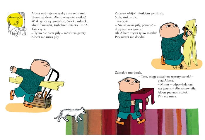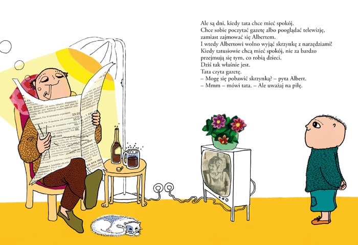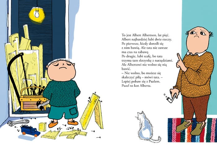 "Kiedy tatusiowie chcą mieć spokój, nie za bardzo przejmują się tym, co robią dzieci. Dziś tak właśnie jest. Tata czyta gazetę. – Mogę się pobawić skrzynką z narzędziami? – pyta Albert. – Mmm – mówi tata. – Ale uważaj na piłę." Fragment książki Albert Albertson to kilkuletni chłopiec, który chodzi do przedszkola i mieszka z bardzo miłym tatą. Dzieci rozpoznają w Albercie swoje zachowania i emocje – radość zabawy, ciekawość świata, nieograniczoną fantazję, ale też złość, zazdrość czy strach. Książki o Albercie, tłumaczone na kilkadziesiąt języków, rozeszły się dotąd w niemal ośmiomilionowym nakładzie w Szwecji i poza jej granicami, a na ich kanwie powstały liczne spektakle teatralne i filmy animowane. W Szwecji to już kultowa seria, licząca około trzydziestu tytułów. Jej autorka i ilustratorka, Gunilla Bergström, otrzymała za swoją twórczość wiele nagród i wyróżnień, włącznie z wyborem jej książki na książkę roku 1997 przez szwedzkie Jury Dziecięce. W 2012 roku mija 40 lat od ukazania się pierwszej historii o Albercie Albertsonie, który w Szwecji nazywa się Alfons Aberg. Jubileusz jest tam hucznie obchodzony, a sprawczyni całego zamieszania, Gunilla Bergström, uhonorowana została przez szwedzki rząd medalem Illis quorum za "nowatorską twórczość literacką i ilustratorską oraz niezwykłą umiejętność przyjmowania dziecięcej perspektywy". Nie mamy wątpliwości, że zaprzyjaźnicie się z Albertem Albertsonem i jego tatą od pierwszego czytania!