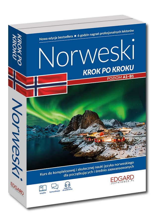 Jeśli szukasz kursu do nauki języka norweskiego, który poprowadzi cię od poziomu początkującego do poziomu średnio zaawansowanego, sprawdź Norweski Krok po kroku. Najnowsze wydanie kursu językowego do nauki norweskiego to zestaw dwóch książek wraz z nagraniami do pobrania. To idealna książka do norweskiego dla zaczynających naukę języka, a także dla tych, którzy chcieliby odświeżyć znajomość języka w szybki, przejrzysty i praktyczny sposób. Norweski Krok po kroku to kompletny kurs językowy, dzięki któremu przejdziesz krok po kroku od poziomu podstawowego A1 do poziomu średnio zaawansowanego B1.