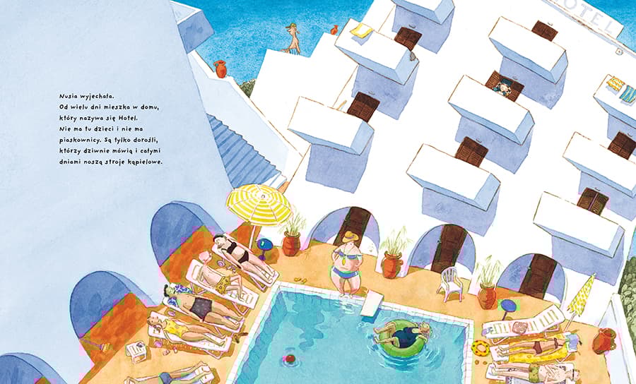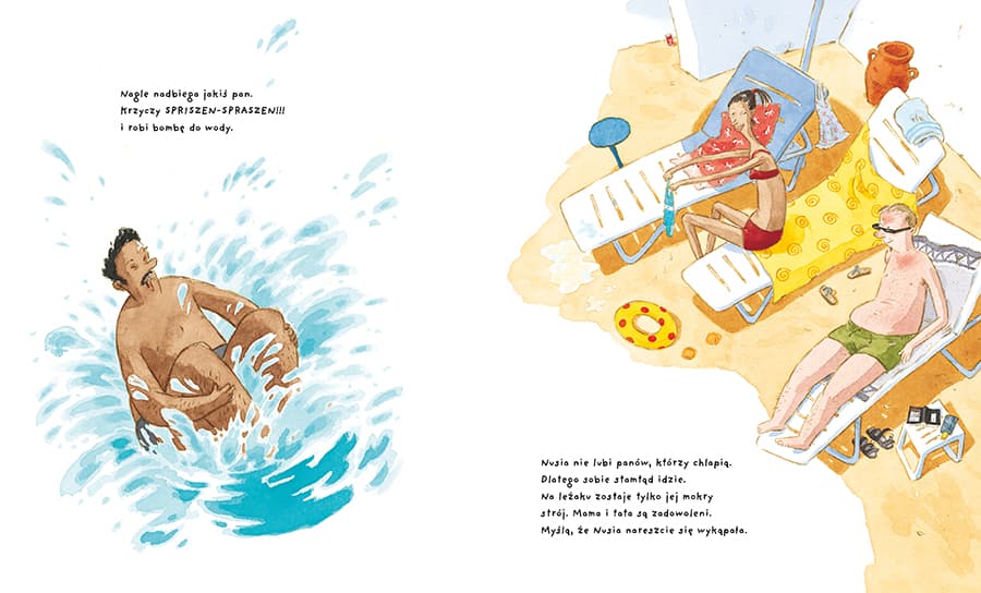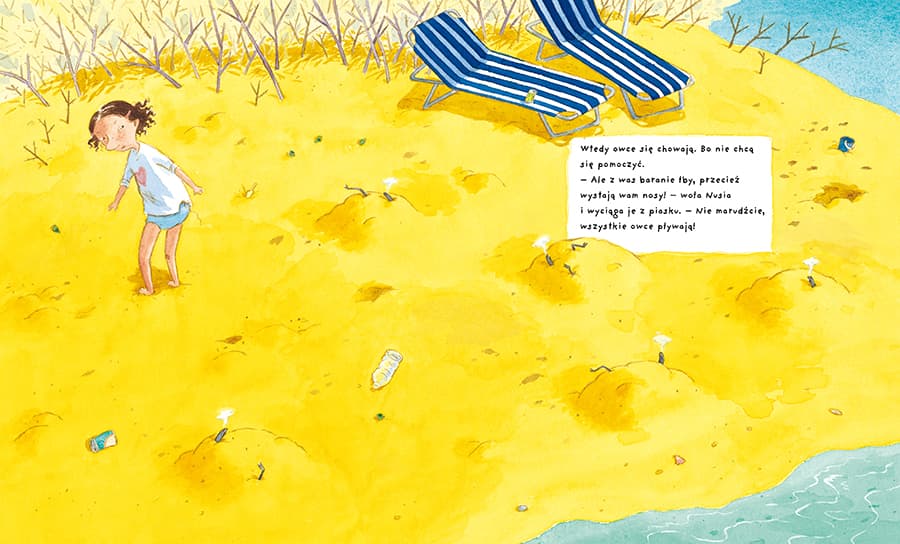 Czy wszystkie dzieci lubią się kąpać? Tak twierdzi tata. Ale Nusia, która właśnie wyjechała z rodzicami na wakacje, wcale nie chce się kąpać. Najchętniej pobawiłaby się w piasku, ale przy hotelowym basenie nie ma ani ziarnka. Nusia wymyka się za hotel, gdzie oprócz piasku znajduje wyspę, a na niej kilka strasznie spoconych, wygłodniałych owieczek. Kto jak kto, ale Nusia potrafi się nimi zaopiekować! A nawet - nauczyć je pływać. Pełna humoru opowieść wnikająca w świat dziecka i jego wyobraźni. Opowieść tym, jak dzieci świetnie sobie radzą, kiedy mogą poczuć się za kogoś odpowiedzialne. Potrafią wpaść na mnóstwo świetnych pomysłów, a nawet - pokonać własne słabości. Pija Lindenbaum jest wnikliwą obserwatorką niearanżowanych przed dorosłych dziecięcych zabaw i dziecięcego sposobu myślenia. A swoje spostrzeżenia potrafi genialnie przelać na papier - powstaje oszczędna w słowach, ale jakże pełna znaczeń opowieść, której drugim głosem są pełne niezwykłych barw i zabawnych szczegółów ilustracje. Nic dziwnego, że dzieci odnajdują w jej książkach swój świat!