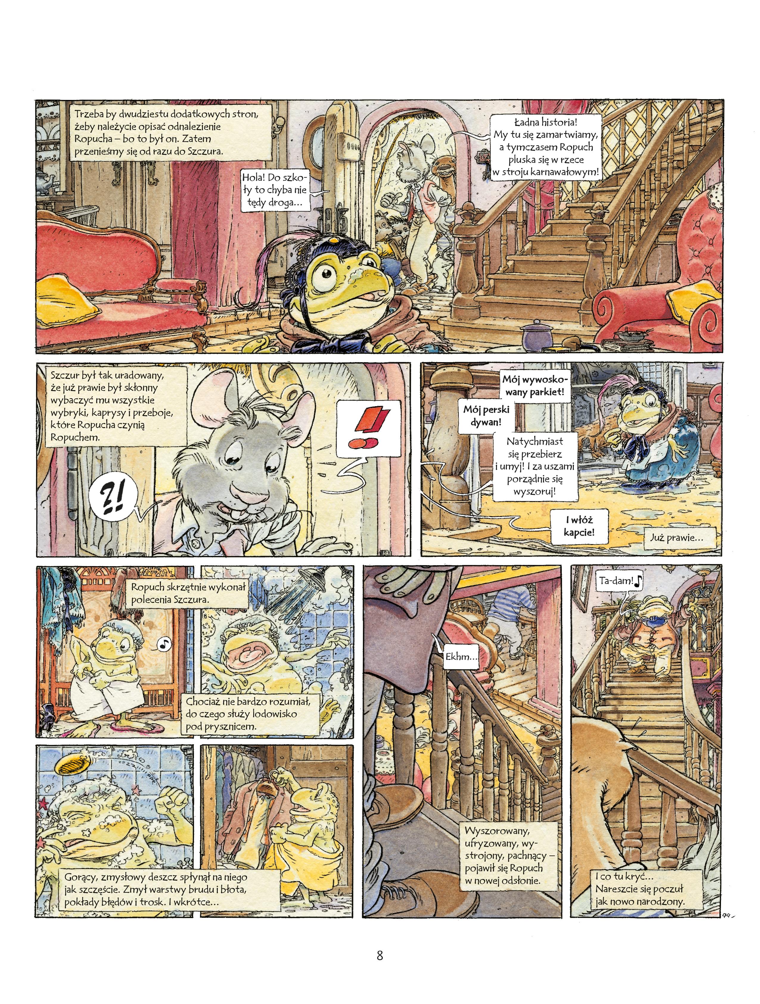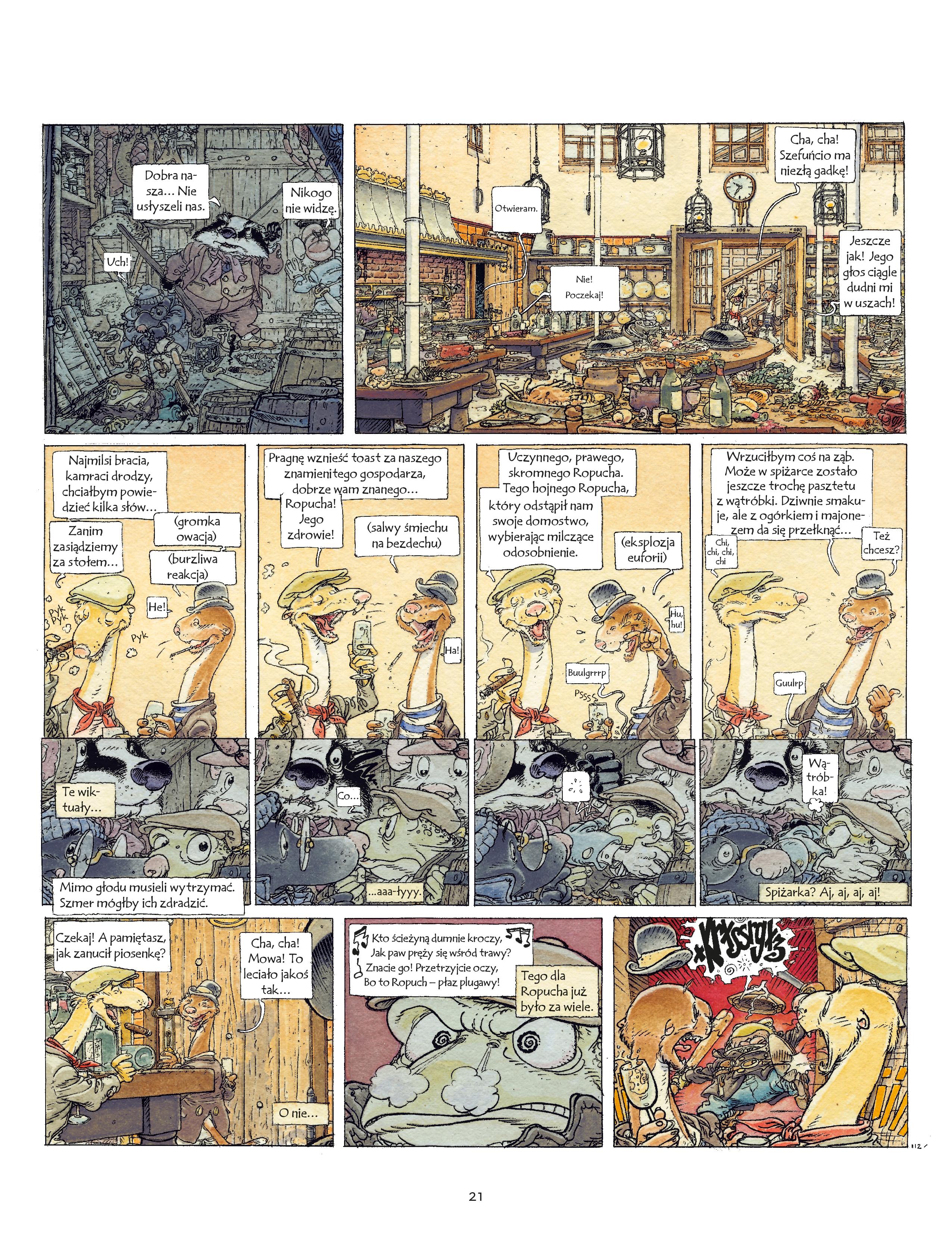 Ropuch wyciągnął lekcje ze swoich brawurowych przygód i postanowił się zmienić. Koniec z automobilami i szaleńczą jazdą. Od dzisiaj będzie łagodny jak baranek, sumienny i roztropny. Zajmie się uprawą kwiatów i będzie wiódł życie przykładnego ziemianina. Ale, ale… Nieszczęście! Ktoś najechał jego posiadłość! Łasice, kuny i gronostaje z puszczy zasiedliły ropusze ziemie i wdarły się do jego rezydencji! Rozsierdzony Ropuch, wbrew wcześniejszym obietnicom, podjął ostateczną decyzję: za wszelką cenę musi odzyskać swój dwór! Szykuje się niezła draka… Niezwykła baśń „O czym szumią wierzby” Kennetha Grahame’a, uchodząca za perłę literatury angielskiej, wielokrotnie ekranizowana, doczekała się pierwszego wydania na kartach komiksu. Pełnowymiarowe barwne postacie, wyjątkowe poczucie humoru i bijąca z każdej strony czułość do przyrody oczarowały czytelników na całym świecie, w tym Michela Plessixa, dzięki któremu powstała urzekająca adaptacja komiksowa, subtelna i pełna fantazji.