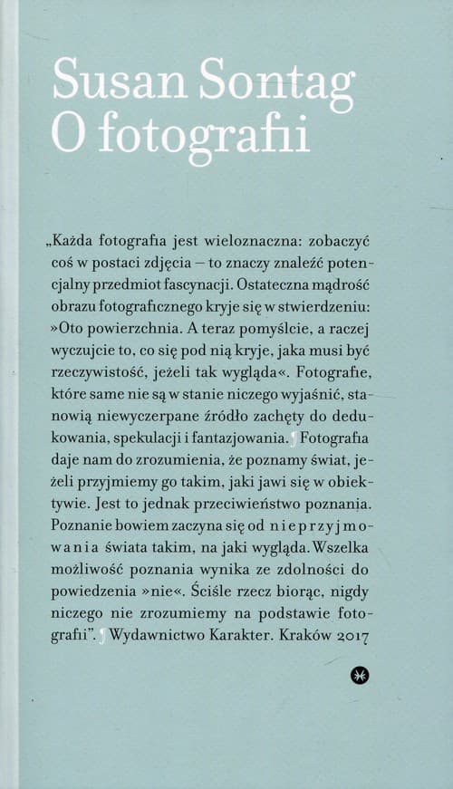 Najważniejsza w historii książka poświęcona fotografii. Wybitna amerykańska intelektualistka bada znaczenie i funkcję fotografii we współczesnym świecie. Czym w swej istocie jest fotografia? Jakie są jej związki z malarstwem i sztuką? Jak zjawisko fotografii zmieniło nasz sposób postrzegania świata? W jakim stopniu fotografia interpretuje rzeczywistość? Jaka jest relacja między fotografem i obiektem oraz między zdjęciem a patrzącym? Na czym polega współczesny heroizm widzenia? Z jakich powodów sięgamy po aparat fotograficzny? Dlaczego skłonni jesteśmy przechowywać zdjęcia bliskich nam osób? Autorka analizuje prace wybitnych fotografów, przytacza teksty pisarzy i filozofów, ale pisze również o fotografowaniu jako części codziennego życia, swoistym społecznym rytuale, starając się zrozumieć jego funkcję i sens. Głośna książka Susan Sontag to nie tylko zbiór błyskotliwych esejów o fotografii, lecz też pasjonująca, wnikliwa analiza współczesnego świata. Bo przecież, jak sama pisze, „zbierać fotografie to zbierać świat".