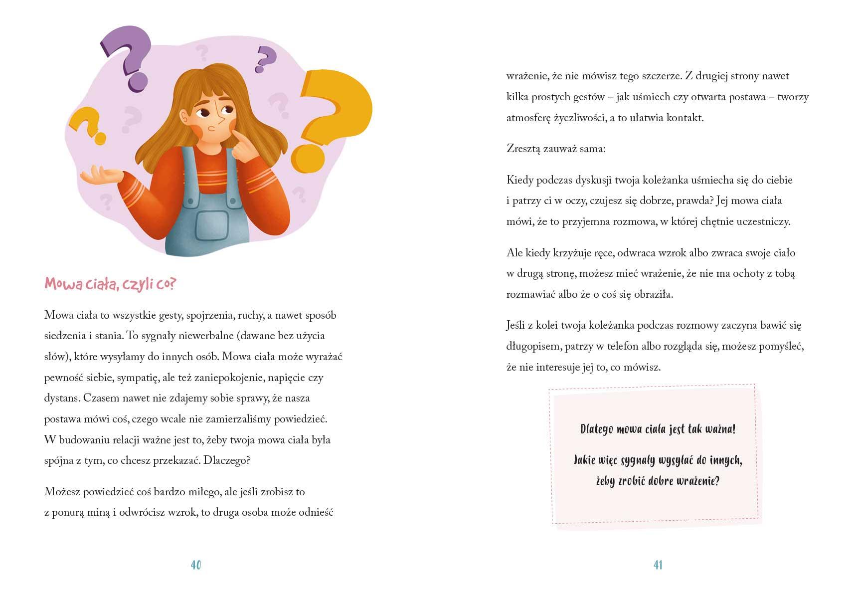 Książka skierowana jest do młodych czytelników, którzy zaczynają budować pierwsze poważniejsze relacje z rówieśnikami. W poradniku poruszone zostały tematy, . jak zyskać przyjaciół, jak radzić sobie z kłótniami wśród znajomych, jak nie stracić siebie w chęci zaimponowania rówieśnikom, jak odnaleźć się w nowym środowisku, co oznacza bycie dobrym przyjacielem.