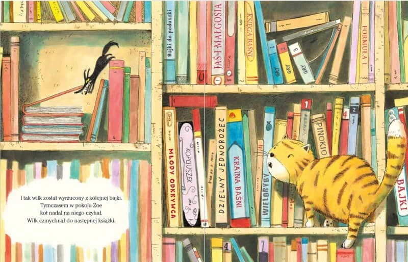 Bum! Wilk wypadł z książki! W swojej historyjce był strasznym wilkiem z ostrymi kłami, ale w pokoju, w którym się znalazł stanął oko w oko z ogromnym, czyhającym na niego kotem. Wilk szybko wślizgnął się do innej książki. Kto zgadnie, do której historii wskoczył? Ciekawe ilustracje i znajome historyjki sprawiają, że książka stanie się intrygującą przygodą.