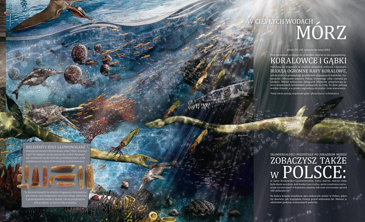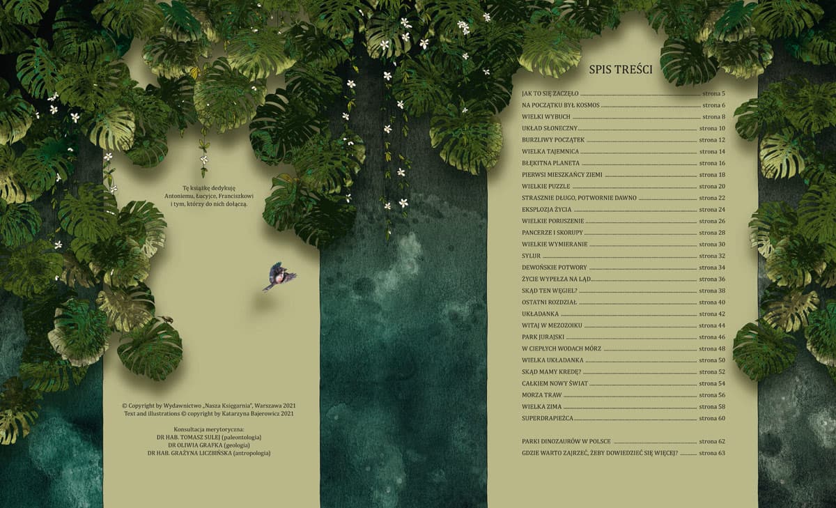 Kiedy i jak powstał Wszechświat, którego częścią jesteśmy? Skąd się wzięło życie? Jak wyglądała Ziemia, zanim pojawił się na niej człowiek? Co było na początku? Od zarania dziejów ludzkość zadawała sobie te pytania i szukała na nie odpowiedzi. Katarzyna Bajerowicz na stronach swojej pięknie zilustrowanej książki proponuje podróż w czasie aż do prapoczątków wszystkiego: planet, kontynentów, żywych komórek, roślin i zwierząt. Przeczytamy o wielkich katastrofach i triumfie życia, o zwierzętach, które wymarły, i tych, które przetrwały, o zmianach klimatu i ewolucji organizmów. Ta fascynująca wyprawa rozpoczyna się wiele miliardów lat temu i kończy w momencie pojawienia się człowieka. Bo to już temat na całkiem inną opowieść. "Książka, którą trzymasz w rękach, nie jest encyklopedią. Występujące tu obok siebie gatunki zwierząt dzieli nieraz wiele milionów lat, ale łączy przyporządkowanie do poszczególnych okresów geologicznych. Prawdopodobnie te stworzenia nie wyglądały dokładnie tak, jak je przedstawiamy. Żyły jednak na tyle dawno temu, że dziś możemy się tylko domyślać ich zwyczajów. Niemal każdego dnia paleontolodzy odkrywają nowe skamieniałości, tworzą rekonstrukcje i dowiadują się więcej o przeszłości naszej planety. To niezwykłe i zajmujące. Ty też możesz pogłębiać wiedzę na temat historii Ziemi. Rozwijaj swoją ciekawość, czytaj i zwiedzaj muzea." Katarzyna Bajerowicz Katarzyna Bajerowicz – poznanianka, mama, babcia, opiekunka prawie-wilka i dwóch tygrysów. Prowadzi bloga mama3swinek.blogspot.com. Maluje, rysuje, rzeźbi, gotuje, obserwuje. Wymyśla sobie wciąż nowe zajęcia, nowe hobby i nowe techniki do poznawania. Lubi dzielić się tym, co wie, a to, czego nie wie, traktuje jak kolejne wyzwanie.