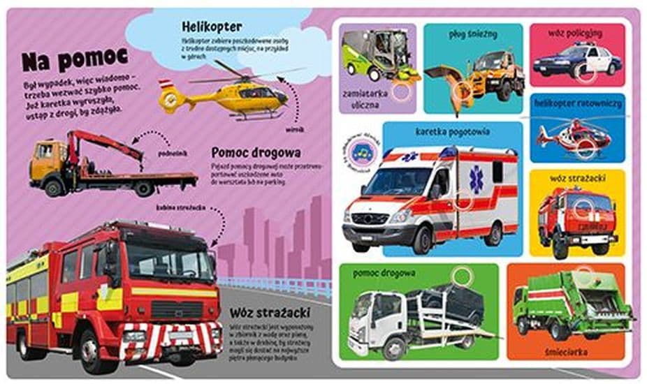 Publikacja z MODUŁEM DŹWIĘKOWYM! Dziecko odkryje 6 RÓŻNYCH DŹWIĘKÓW wydawanych przez pojazdy. Do lektury zachęcają SYMPATYCZNE ILUSTRACJE i PROSTE HISTORYJKI. To KSIĄŻKA POLISENSORYCZNA – działa na zmysły WZROKU, SŁUCHU i DOTYKU. Publikacja zawiera krótkie SCENKI RODZAJOWE, których bohaterami są DZIECI oraz POJAZDY. Do każdej historyjki jest dopasowany PRZYCISK DŹWIĘKOWY. Po jego naciśnięciu maluszek usłyszy np. KLAKSON SAMOCHODU lub SYRENĘ WOZU STRAŻACKIEGO. Atutem książki są również KOLOROWE WYPUSTKI z obrazkami przedstawiającymi pojazdy. Dzięki nim można łatwo otworzyć książkę na wybranym dźwięku. Książka: • zapoznaje z dźwiękami wydawanymi przez KILKA POJAZDÓW • wspiera WSZECHSTRONNY ROZWÓJ dziecka • uczy PRZYPORZĄDKOWYWANIA obiektów • inspiruje do KREATYWNEJ ZABAWY • rozwija WYOBRAŹNIĘ • wzbogaca SŁOWNICTWO ODKRYWAM DŹWIĘKI Seria przeznaczona dla MŁODSZYCH DZIECI, składająca się z książeczek z MODUŁEM DŹWIĘKOWYM. Urzeka CIEKAWYMI OPOWIASTKAMI, którym towarzyszą PRZYJAZNE ILUSTRACJE w nasyconych kolorach. Angażuje zmysły WZROKU, SŁUCHU i DOTYKU.