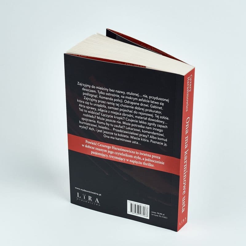 Dwie kobiety, dwa pokolenia, jedno śledztwo, które może je zniszczyć… Zajrzyjmy do mieściny bez nazwy, otulonej… nie, przyduszonej deszczem. Tylko ostrożnie, na mokrym asfalcie łatwo się poślizgnąć. Komenda policji. Odrapane drzwi. Gabinet. Zajrzyjmy przez ramię tej cholernie dobrej prokurator, która się tu urządziła, zamiast pojechać do rejonowej. Tej zołzie. Akta sprawy, zdjęcia z miejsca zbrodni, materiał dowodowy… Też to widzicie? Łączycie kropki? Czujecie lekko zgniły zapach rozkładu? Może jeszcze nie. Może potrzeba nam innego spojrzenia. Komu by tu zaufać? Lekarzowi, komendantowi, burmistrzowi, księdzu… Przedstawicielowi prasy? Albo komuś wyżej? Ach, i jest jeszcze ta kobieta. Wiecie która. Poznacie ją. Ona ma karminowe usta… Najnowsza powieść Cezarego Harasimowicza to świetna proza w dobrze znanym jego czytelnikom stylu, a jednocześnie pasjonujący, trzymający w napięciu thriller.