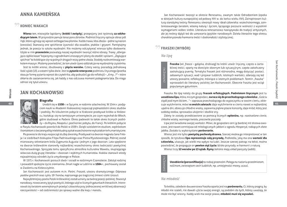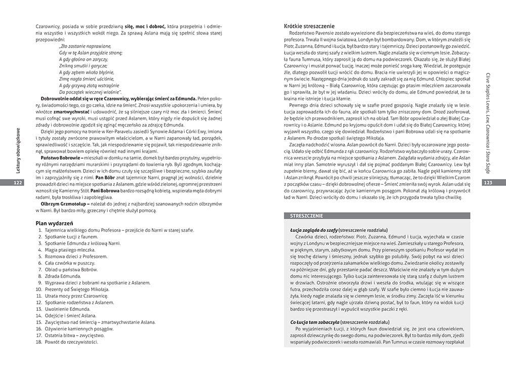 Można tu znaleźć biografię autora, plan wydarzeń, charakterystyki bohaterów, dokładne streszczenia i problematykę każdego utworu, a w przypadku wierszy także krótką analizę budowy. Absolutną nowością są krótkie streszczenia – pozwalające w kilka chwil zapoznać się z zarysem fabuły wystarczającym do skrótowego opisania tematu i akcji książki. Każda z części serii napisana została prostym językiem, zrozumiałym dla ucznia danych klas.
