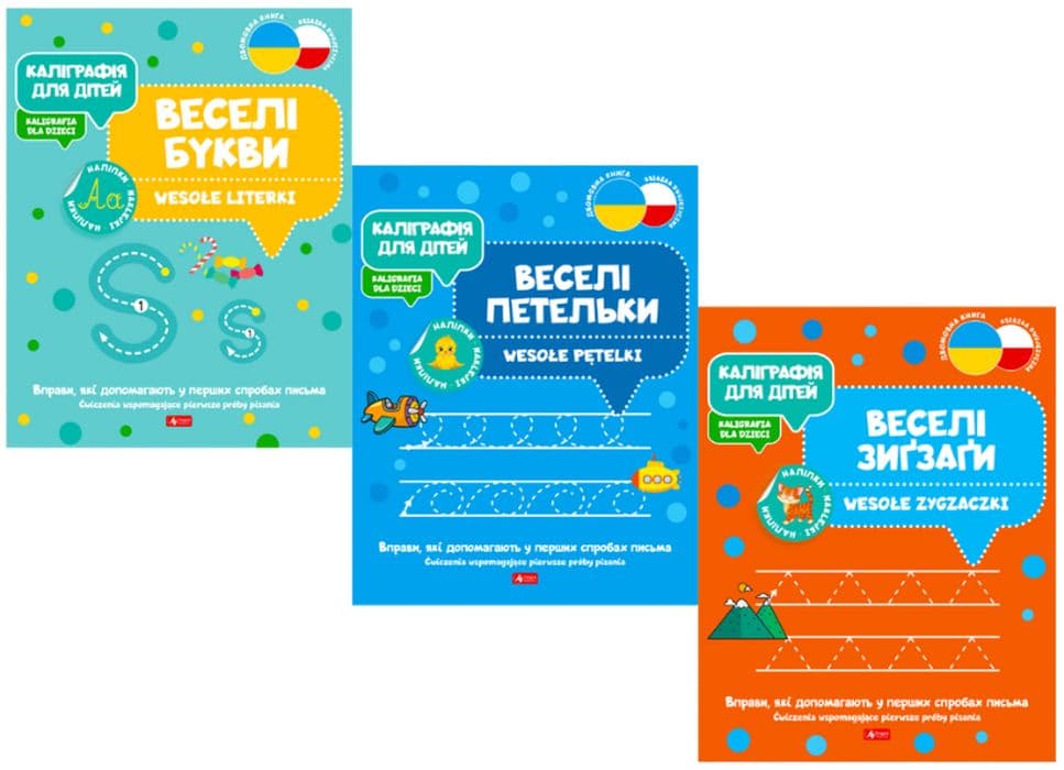 Kaligrafia dla dzieci wer. Ukraińska: Каліграфія для дітей / Kaligrafia dla dzieci to seria dwujęzycznych zeszytów zawierających ćwiczenia wspomagające pierwsze próby pisania.