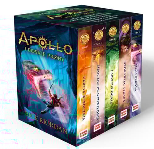 Pięć tomów bestsellerowej serii "Apollo i boskie próby" w specjalnie zaprojektowanym pudełku.