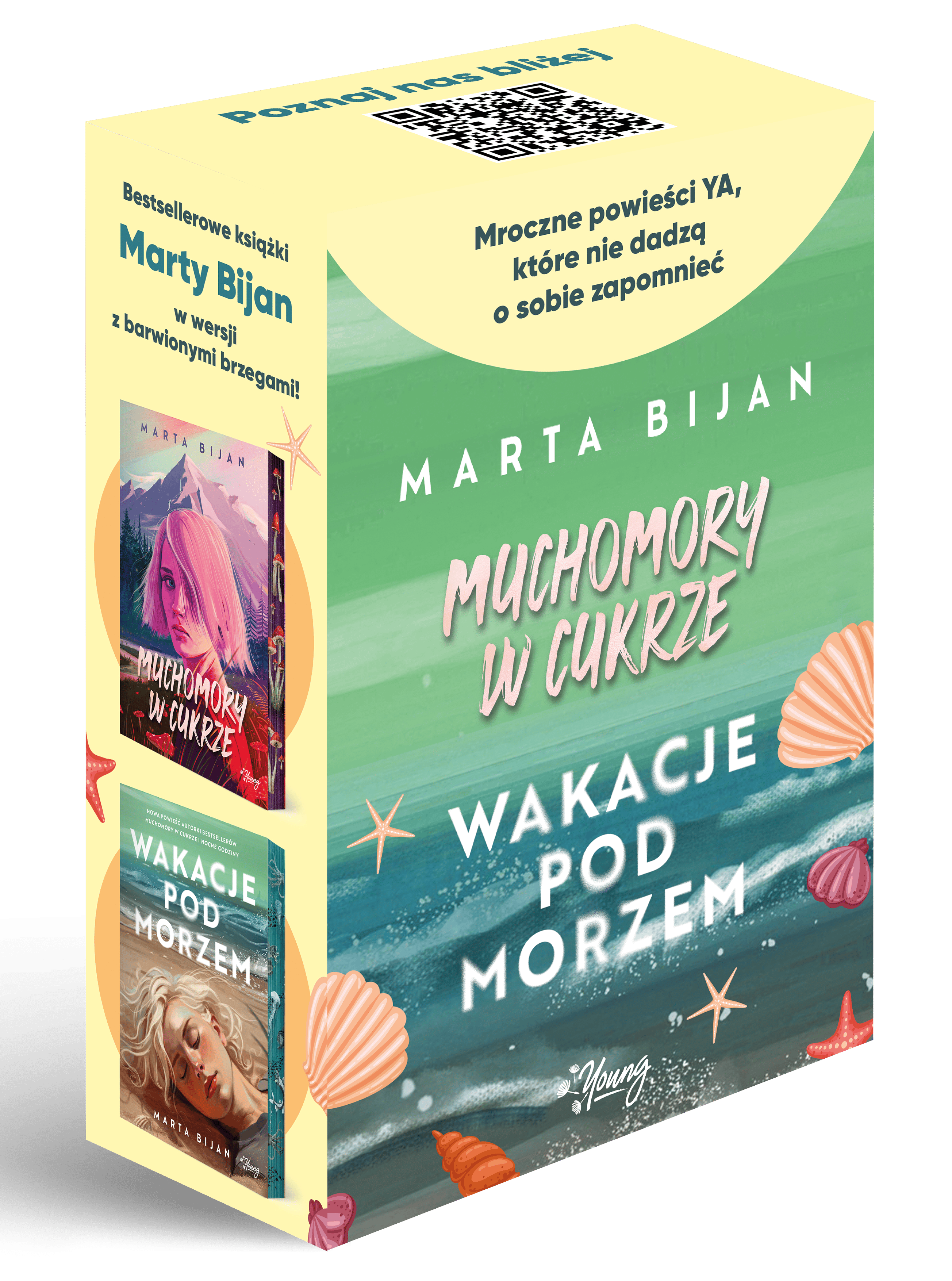 Jeśli kochasz mroczne książki young adult, to nie możesz przegapić lektury bestsellerowych „Wakacji pod morzem” oraz „Muchomorów w cukrze” w wyjątkowej wersji z barwionymi brzegami. Czas zatracić się w twórczości Marty Bijan! „Muchomory w cukrze” nowa wersja z barwionymi brzegami Gdy wymarzone wakacje zamieniają się w koszmar i nie wiesz już komu zaufać… Pięcioro maturzystów: Fio, Wenus, Hanna, Kostek i Robin, spędza lato w Domku z Drewna i Szkła, należącym do tajemniczego Adama, przybranego brata Kostka. Dom w środku lasu wydaje się idealnym miejscem, w którym można odciąć się od problemów. Niestety, nic nie jest tu takie, jakie powinno być. Wszystko zaczyna wymykać się spod kontroli, a odpowiedź na pytanie, kim tak naprawdę jest Adam, okazuje się niejednoznaczna. Odcięci od świata, pośrodku niczego, nastolatkowie nie potrafią już odróżnić wrogów od przyjaciół. „Wakacje pod morzem” Leo prawie nie sypia. Leo nigdy nie płacze. Leo ciągle kłamie. Hotel Bursztyn nad polskim morzem wydaje się kolejnym letnim miejscem, ale dla Leo to coś więcej. Kiedy do życia dziewczyny i jej brata nagle wraca Filip, z którym kiedyś spędzali wakacje, głęboko skrywane uczucia zaczynają wychodzić na jaw podczas letniego stażu. Leo wreszcie będzie musiała zmierzyć się z tym, co próbowała całe życie od siebie odsuwać – z prawdą.Szczegółowe informacje na temat książki Pakiet Muchomory w cukrze / Wakacje pod morzem