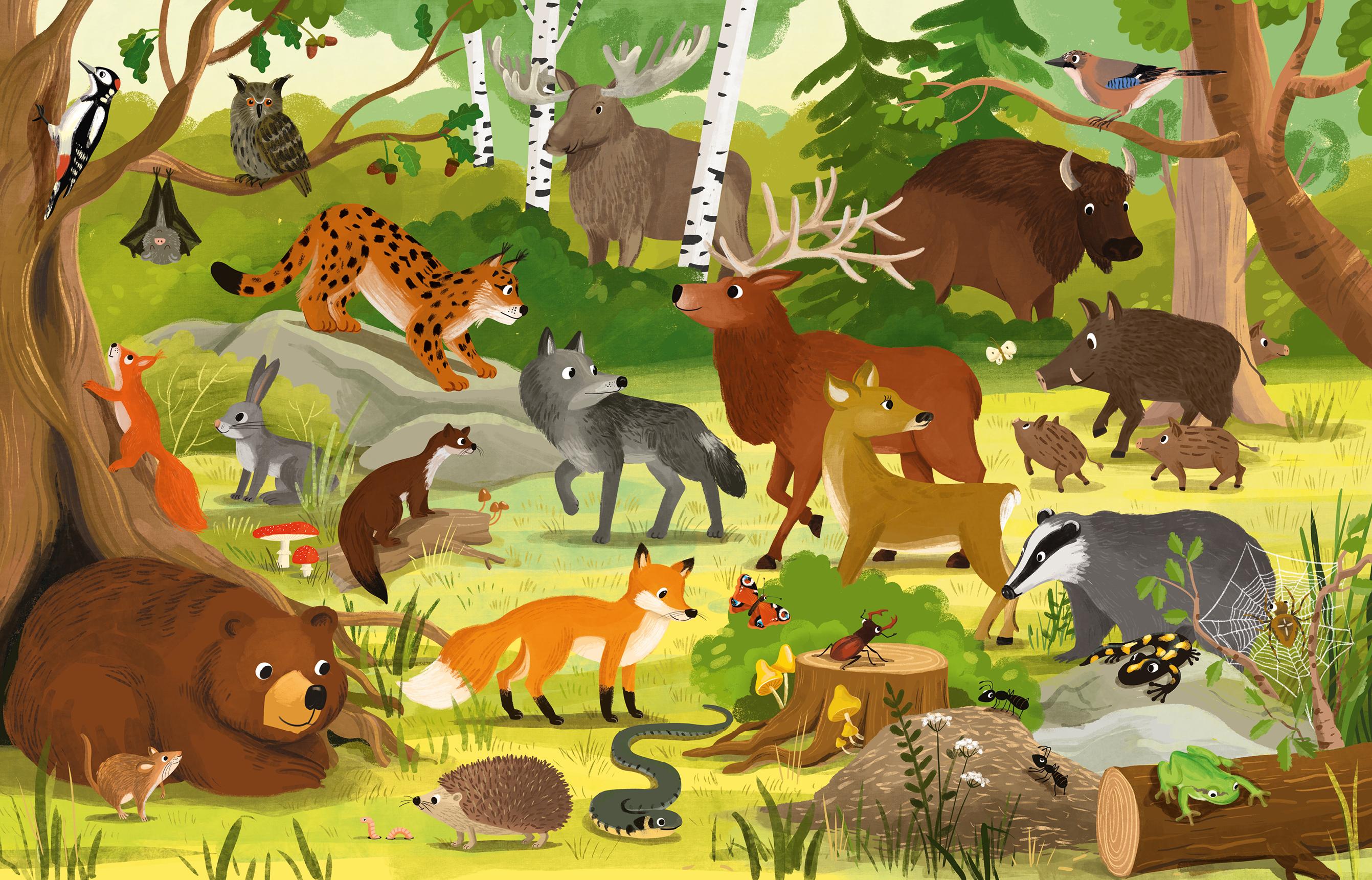 W skład zestawu wchodzi także kartonowa książka o leśnych zwierzętach oraz plakat.