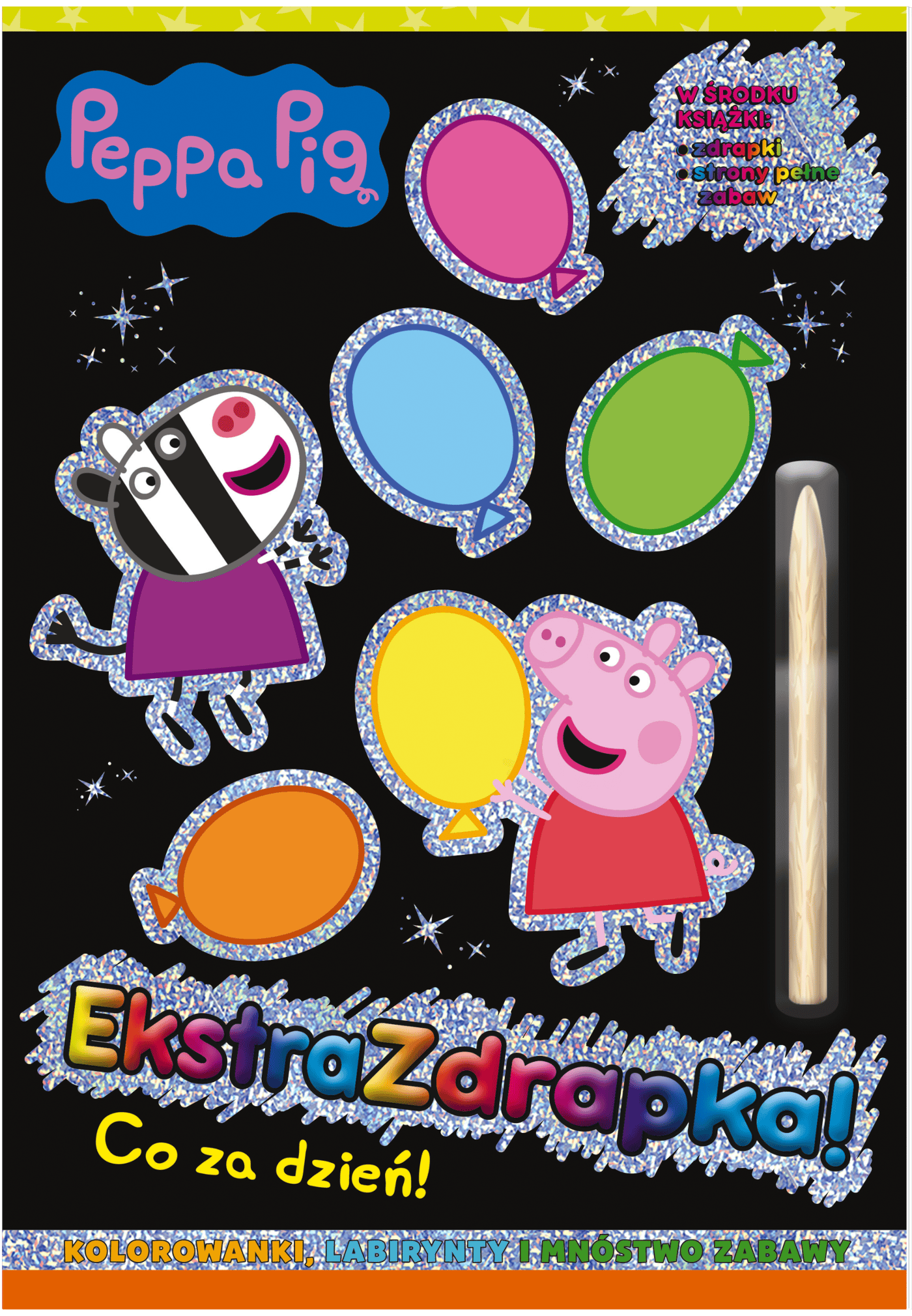 Peppa Pig. Ekstrazdrapka to atrakcyjna książka wspomagająca zdolności manualne u dzieci. Zawiera kolorowanki, labirynty, kolorowe strony do zdrapywania oraz rysik. Wystarczy rysikiem zdrapać farbę, aby pojawiły się błyszczące obrazki lub wielobarwne ilustracje z Peppą, jej rodzinką i przyjaciółmi.Szczegółowe informacje na temat książki Peppa Pig Ekstrazdrapka Co za dzień!