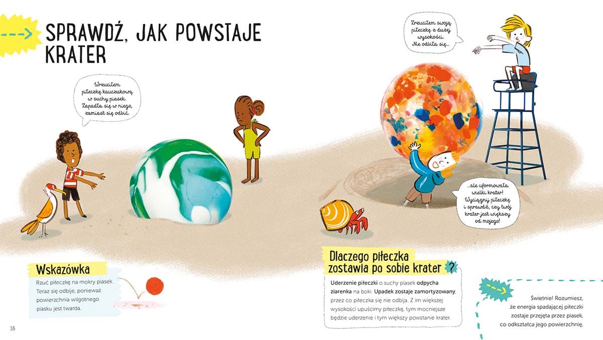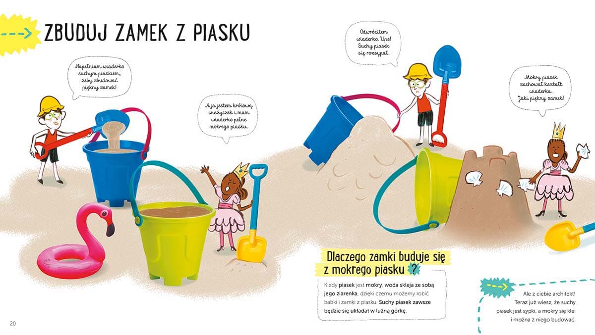 Plaża czy piaskownica to prawdziwa kopalnia zabaw. Dzieci uwielbiają bawić się piaskiem, warto więc ten zapał wykorzystać, by twórczo poeksperymentować. Pomysły można zaczerpnąć z książki Piasek, kolejnej części serii Przygody z nauką. Lepiąc zamki, przesypując ziarenka czy robiąc błoto, dzieci odkrywają podstawowe prawa nauki i dowiadują się ciekawych rzeczy, m.in. jak zrobić udaną babkę i krater; zmierzyć czas za pomocą piasku i sprawić, by ziarenka podskakiwały. Przygody z nauką to seria nowoczesnych książeczek stworzonych w duchu STEAM zachęcających do samodzielnego eksperymentowania i wyciągania wniosków. Jej bohaterami są dzieci, angażujące czytelników do zabawy, treści stworzone i konsultowane przez ekspertów. Każda książeczka zawiera 10 prostych, ciekawych, dostosowanych do wieku doświadczeń z użyciem powszechnych składników.Szczegółowe informacje na temat książki Piasek Akademia mądrego dziecka Przygody z nauką