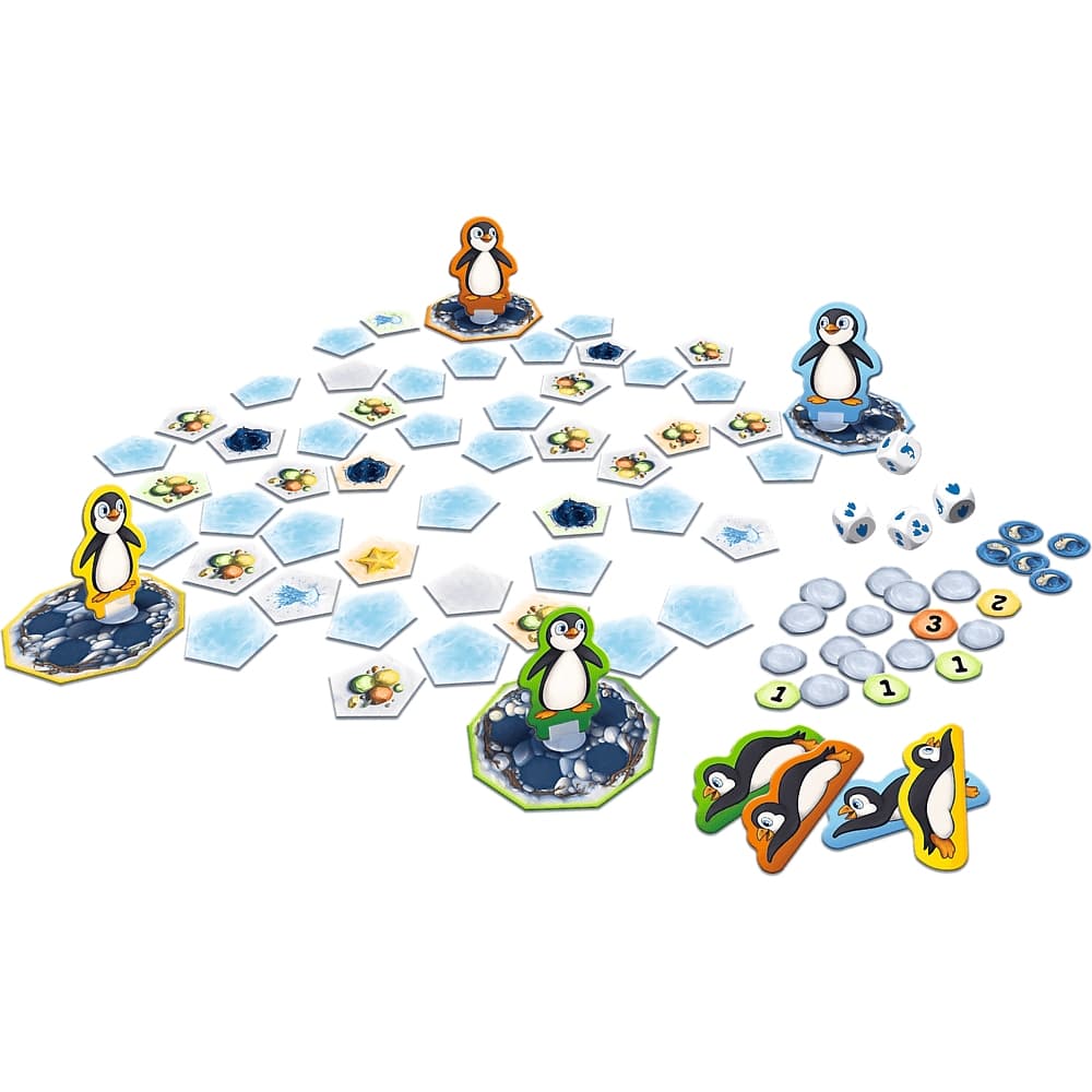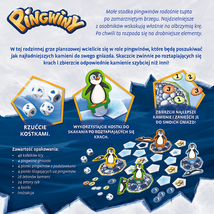 Czy wiedzieliście, że pingwiny dają sobie w prezencie... kamienie? W grze rodzinnej Pingwiny przeniesiecie się do mroźnej krainy, gdzie sympatyczne pingwinki skaczą po kruchej krze w poszukiwaniu najpiękniejszych kamieni, z których zbudują swoje wymarzone gniazda. Ale uwaga – lód pod nogami jest nieprzewidywalny i za każdym razem, gdy któryś z graczy wskoczy na nowy odłamek kry, wszystko może się zmienić! Wiek graczy: 6+ Liczba graczy: 2-4 Czas rozgrywki: 20 minut