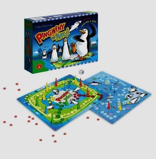 "Pingwiny w akcji" to 2 gry planszowe. Pierwsza gra - "Ucieczka z ZOO" polega na tym, że każdy z graczy ma swoją drużynę pingwinów, które chcą jak najszybciej wydostać się z ZOO. Zwycięzcą w tej grze zostanie gracz, który pierwszy przeprowadzi swoje pingwiny poza jego mury. W drugiej grze "Na ryby" pingwiny ruszają na połów ryb. Krążąc po torze planszy gracze starają się trafić jak najszybciej na pola, które premiowane są żetonem- czyli rybą. Zwycięży ten , kto zdobędzie najwięcej ryb. W czasie połowu trzeba jednak uważać, by nie dostać się w paszczę rekina. Zawartość pudełko: dwustronne plansze, 16 pionków, 23 żetonów, kostka do gry, instrukcja. 2-4 graczy Wiek: 4+