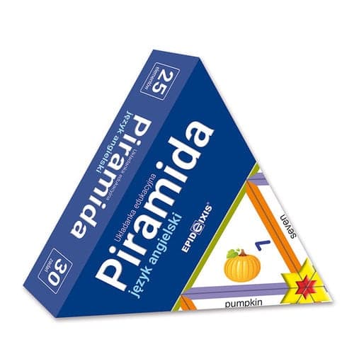 Piramida to wspaniała zabawa połączona z nauką, ponieważ rozwija u dziecka zdolność do myślenia i zapamiętywania, uczy wytrwałości, wzmacnia koncentrację i skutecznie pomaga przezwyciężyć trudności w procesie uczenia się. Budowanie piramidy jest proste i odbywa się na zasadzie gry w domino, w efekcie rozwiązania wszystkich zadań otrzymujemy imponującą piramidę. Piramida język angielski JA1 to zbiór 30 zadań dla dzieci młodszych rozpoczynających naukę języka angielskiego w domu, w przedszkolu i szkole. Zakres słownictwa obejmuje takie zagadnienia jak: kolory, cyfry, owoce i warzywa. W zestawie znajduje się 25 trójkątów. Piramida jest rekomendowana przez logopedów, pedagogów i psychologów jako wartościowy materiał edukacyjno – terapeutyczny. Oferta tematyczna Piramid: Logopedyczna L1: ś – ź – ć – dź; Logopedyczna L2: b – p , d – t , w – f; Ortograficzna P1 : zasady pisowni – ó, u, rz, ż, ch, h; Ortograficzna P2 : zasady pisowni – wymienne; Matematyczna M1: dodawanie do 100; Matematyczna M2: tabliczka mnożenia. Matematyczna M3: odejmowanie do 100; Matematyczna M4: dodawanie/odejmowanie do 100 Matematyczna M5: mnożenie/dzielenie do 100 Język angielski JA1: dla najmłodszych