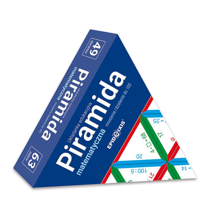 Piramida to wspaniała zabawa połączona z nauką, ponieważ rozwija u dziecka zdolność do myślenia i zapamiętywania, uczy wytrwałości, wzmacnia koncentrację i skutecznie pomaga przezwyciężyć trudności w procesie uczenia się. Budowanie piramidy jest proste i odbywa się na zasadzie gry w domino, w efekcie rozwiązania wszystkich zadań otrzymujemy imponującą piramidę. Piramida matematyczna M5 to nieoceniona pomoc, która dzięki swojej zabawowej formie służy poznawaniu podstaw techniki rachunkowej, utrwaleniu pojęcia liczby, mnożenia i dzielenia. Rozwiązywanie zadań nie służy pamięciowemu opanowaniu umiejętności liczenia. Jest raczej propozycją aktywnej nauki, opartej na kształceniu zdolności formułowania wniosków i samodzielnemu dochodzeniu do wyniku działania. Taki model uczenia się sprzyja stymulowaniu uzdolnień matematycznych u dzieci i wzmacnia ich odporność emocjonalną. Dzięki prawidłowemu rozwiązaniu 63 zadań dzieciom uda się stworzyć imponującą piramidę, która zrekompensuje wysiłek umysłowy poniesiony przy mnożeniu i dzieleniu. Zabawa i nauką z piramidą z pewnością przyniosą wymierne korzyści w szkole, domu i w przyszłym życiu codziennym. W zestawie znajduje się 49 trójkątów. Piramida jest rekomendowana przez logopedów, pedagogów i psychologów jako wartościowy materiał edukacyjno-terapeutyczny. Oferta tematyczna Piramid: Logopedyczna L1: ś – ź – ć – dź; Logopedyczna L2: b – p , d – t , w – f; Ortograficzna P1: zasady pisowni – ó, u, rz, ż, ch, h; Ortograficzna P2: zasady pisowni – wymienne; Matematyczna M1: dodawanie do 100; Matematyczna M2: tabliczka mnożenia; Matematyczna M3: odejmowanie do 100; Matematyczna M4: dodawanie/odejmowanie do 100; Matematyczna M5: mnożenie/dzielenie do 100; Język angielski JA1: dla najmłodszych.