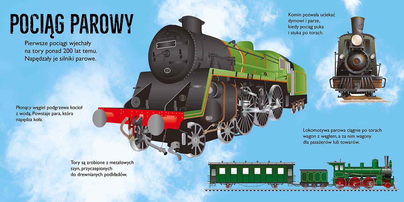 Dokąd jedzie Orient Express? Czym jest pantograf, a czym kolej magnetyczna? Z jaką prędkością może jechać pociąg? W tej książce znajdziesz odpowiedzi na te i wiele innych pytań Książka z serii POP-UP 10 czytelnicy zawiera 10 przestrzennych ilustracji, które przedstawiają różnorodne pociągi sprzed wielu lat, a także najbardziej zaawansowane technologicznie maszyny. Bogactwo interesujących informacji pomoże pogłębić wiedzę o tych pojazdach, zapewni inspirującą lekturę i doskonałą zabawę. Fascynujące POP-UPY dla młodych odkrywców! W serii są dostępne również tytuły: Psy. POP-UP 10 Koty. POP-UP 10 Dinozaury. POP-UP 10Szczegółowe informacje na temat książki Pociągi POP-UP 10