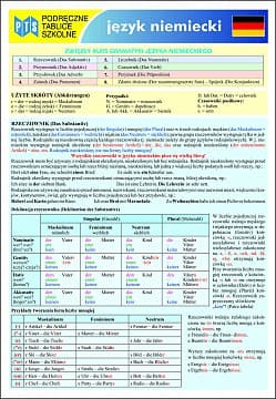 Podręczne Tablice Szkolne. Język niemiecki zawierają podstawowe zasady gramatyki języka niemieckiego wraz z przykładowymi zdaniami. Przedstawiają reguły odmiany gramatycznej wyrazów, użycia rzeczownika, przymiotnika, zaimka, liczebnika, czasownika, przyimka, spójnika oraz budowy zdań złożonych. Tablice są pomocą z gramatyki na poziomie podstawowym i średnim dla gimnazjum, liceum, technikum oraz dla uczących się na kursach językowych. Tablice przydatne są również dla uczących się do Zertifikat Deutsch (ZD) i Zertifikat Zentrale Mittelstufeuprüfung (ZMP).