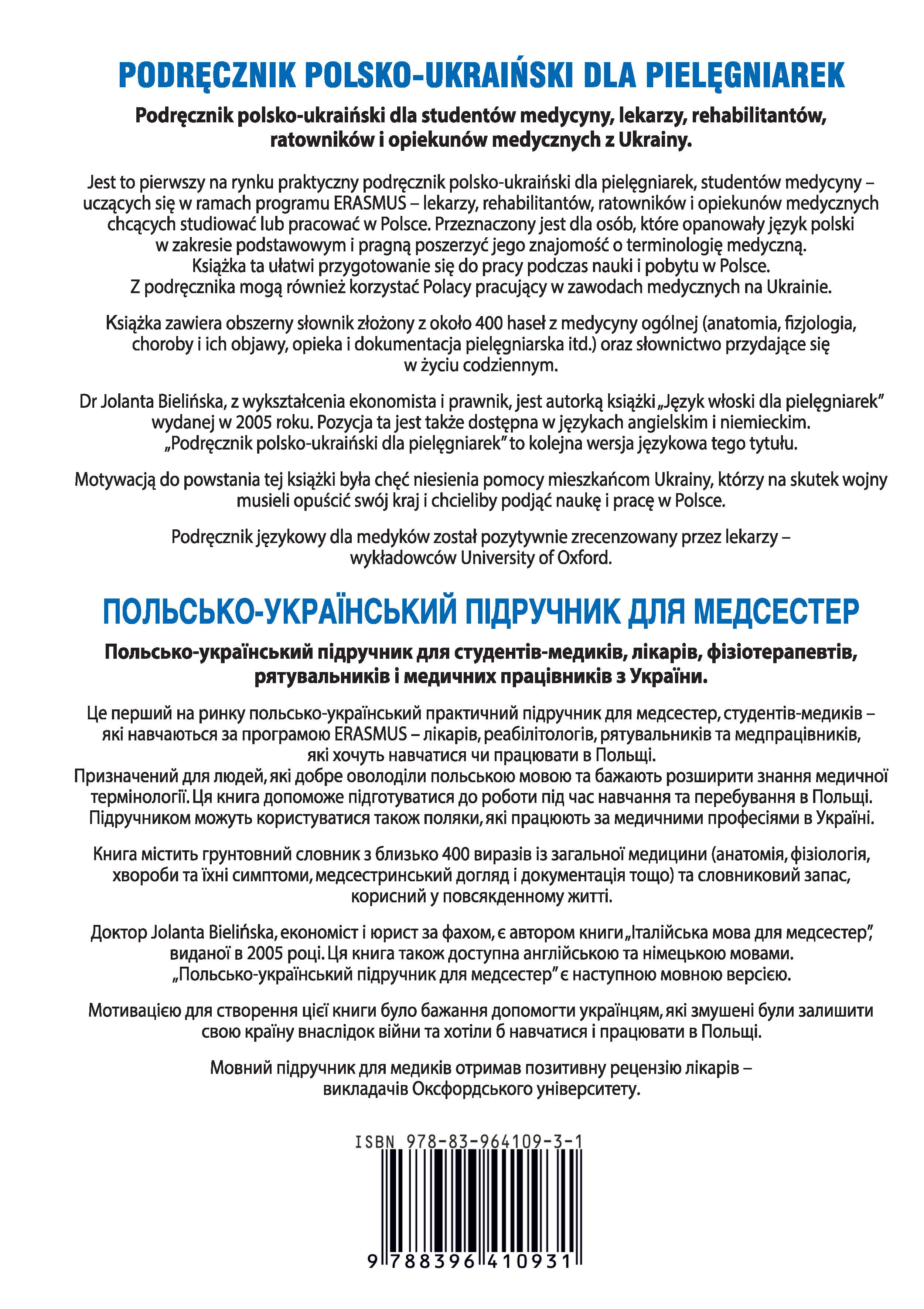 Jest to pierwszy na rynku praktyczny podręcznik polsko-ukraiński dla pielęgniarek, studentów medycyny (uczących się w ramach programu ERASMUS) lekarzy, rehabilitantów, ratowników i opiekunów medycznych chcących studiować lub pracować w Polsce.