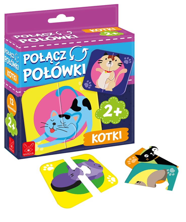 Dzieci bawią się w układanie połówek puzzli wesołych kotków. Gra wspomaga u dzieci koncentrację, rozwój ruchu dłoni oraz wspomaga myślenie przestrzenne.