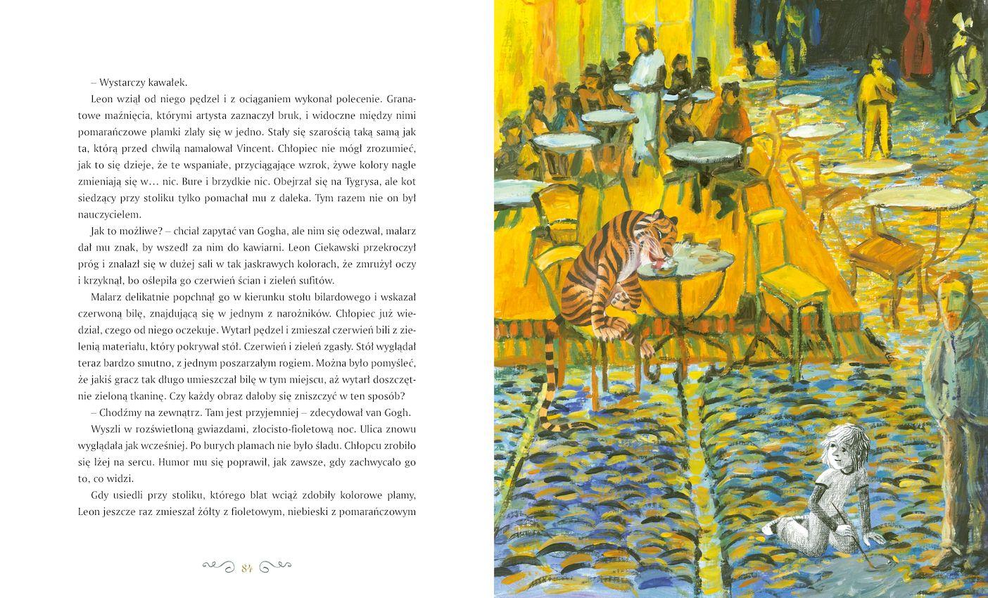 Leon, którego mama pracuje w galerii sztuki, a tata jest malarzem, poznaje zjawiskowego Tygrysa z obrazu Henriego Rousseau. Zwierzak wprowadza chłopca w fascynujący świat malarstwa. Objaśnia, czym jest perspektywa, pokazuje, jak operować kolorami, światłem i cieniem. Wkracza wraz z Leonem w świat dobrze znanych mu obrazów Van Gogha czy Moneta, które nagle ożywają, dzięki wiedzy przekazanej przez Tygrysa. Kolejne dzieła zapadają w pamięć zarówno bohatera książki, jak i naszą. Zaczynamy je lepiej poznawać, rozumieć, czuć. I stają się magiczne.