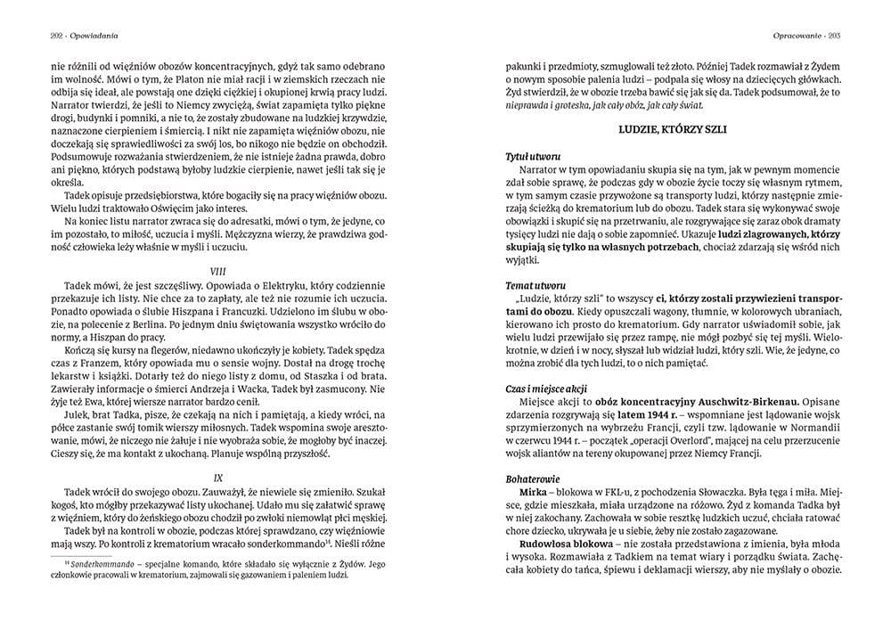Wydanie Pożegnania z Marią i innych opowiadań kompletne bez skrótów i cięć w treści. W tym wydaniu znajdziesz odpowiedzi na pytania z podręcznika - „pewniak na teście”, czyli wskazanie zagadnień, które zwykle pojawiają się w pytaniach z danej lektury we wszelkich testach sprawdzających wiedzę, a także w podręcznikach i na klasówkach. Książka zawiera pełen tekst lektury. Na końcu książki zamieszczono opracowanie, w którym znajduje się bardzo szczegółowe streszczenie oraz drugie skrócone, ułatwiające szybkie przygotowanie się przed lekcją. Opracowanie zawiera ponadto plan wydarzeń, wnikliwie wyjaśnioną problematykę oraz szerokie charakterystyki bohaterów. Literatura wojny i okupacji jest niezwykle istotną częścią literatury polskiej - pozwala zachować pamięć o wydarzeniach II wojny światowej, których każdy człowiek powinien być świadom. Jej częścią jest zbiór opowiadań autorstwa Tadeusza Borowskiego - Pożegnanie z Marią i inne opowiadania. Autor przedstawia rzeczywistość obozu koncentracyjnego w Oświęcimiu, którego sam był więźniem, a także rzeczywistość okupowanej przez nazistów Polski. Narrator nie poprzestaje jednak na opisie faktów, lecz rozwija swój utwór o refleksje moralne, filozoficzne i historiozoficzne, próbuje odpowiedzieć na pytania o to, kim stał się człowiek poddany nazistowskiej przemocy i upodleniu przez zbrodniczy system. Książka niesie ogromny ładunek emocjonalny dzięki swojej prawdziwości i bezkompromisowości. W tym wydaniu znajduje się dziesięć opowiadań, m.in. U nas w Auschwitzu..., Proszę państwa do gazu, Dzień na Harmenzach czy Ludzie, którzy szli, oraz słownik określeń oświęcimskich. Twarda oprawa jest niezwykle trwała i estetyczna. Polecamy!