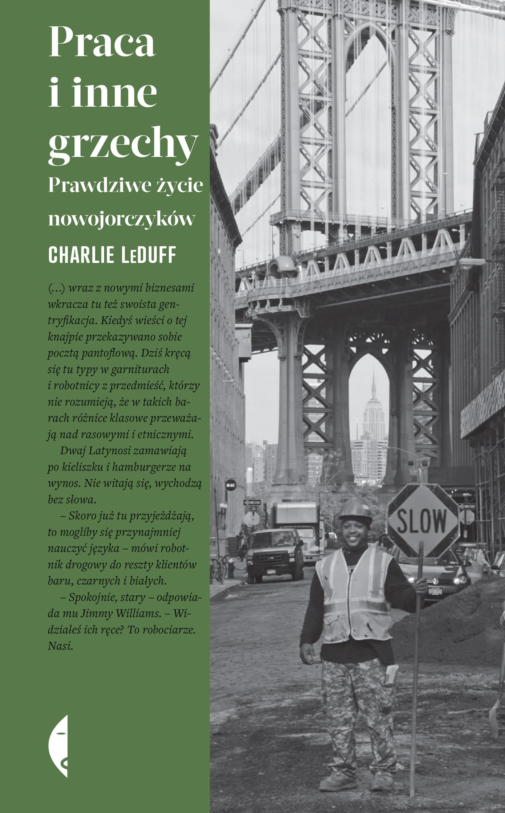 Nowy Jork. Olśniewające miasto przyciągające tłumy marzycieli z całego świata. Od dekad symbol sukcesu, postępu i kariery. Synonim amerykańskiego snu. Bywa jednak najsmutniejszym miejscem na ziemi – gorsze od porażki jest tu bycie niewidzialnym. I to właśnie niewidzialnym LeDuff poświęca swoją książkę. Pisze o tych, którzy mieszkają w ciasnych mieszkaniach. O strażakach i ich rodzinach, którzy po 11 września 2001 roku stracili wszystko. O ludziach, którym rytm pracy, snu i dnia wyznaczają kaprysy szefa, właściciela mieszkania, sędziego w sądzie rodzinnym czy burmistrza. To nie książka o nowojorczykach, którym drzwi otwierają portierzy, tylko o samych portierach. O robotnikach, ulicznych handlarzach, sprzątaczkach, rybakach, imigrantach i barmanach. O ludziach, których na co dzień nie zauważamy, ale których brak okazałby się dotkliwy. Praca i inne grzechy to uniwersalna i błyskotliwa opowieść o etosie pracy i hołd złożony niewidzialnym mieszkańcom amerykańskiej metropolii. To również reporterskie studium rozwarstwienia ekonomicznego i powolnej degradacji klasy robotniczej, tak powszechnych bez względu na szerokość geograficzną.