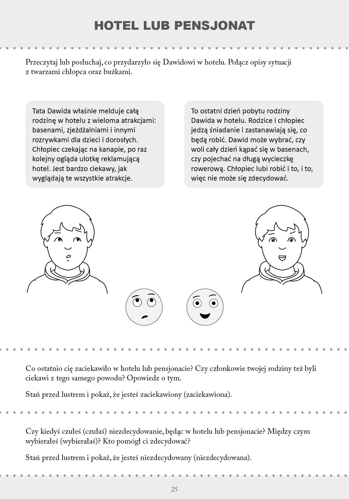 Ich prosta forma (krótkie teksty i pozbawione szczegółów rysunki) umożliwi skupienie się na ćwiczeniu nawet osobom z problemami w zakresie kompetencji społecznych i komunikacyjnych.