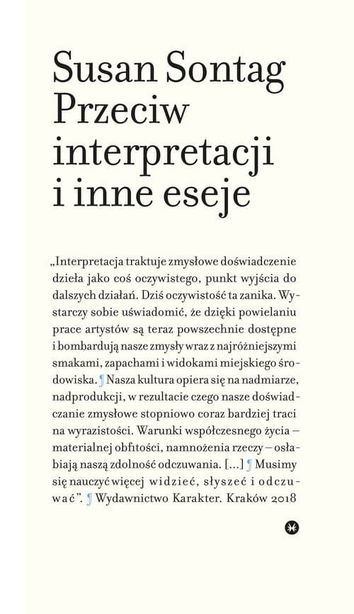 Po raz pierwszy po polsku zbiór głośnych esejów amerykańskiej intelektualistki. Opublikowany w 1966 roku, szybko stał się pozycją klasyczną i wywarł wielki wpływ na myślenie o współczesnej sztuce i kulturze. Sontag w oryginalny, a niekiedy i prowokacyjny jak na tamte czasy sposób pisze m.in. o twórczości Sartre’a, Ionesco i Lévi-Strausse’a, analizuje filmy Godarda i Bressona, podejmuje temat wyobrażenia katastrofy w filmach science fiction czy też zagadnienia współczesnej myśli religijnej. W tomie znalazły się także najbardziej znane teksty Sontag – esej tytułowy oraz Zapiski o kampie, dowodzące jej niezwykłej wrażliwości na nowe zjawiska w kulturze. Jak zaznacza we wstępie sama autorka, wartością tych tekstów jest nie tyle krytyka poszczególnych dzieł, co istotność poruszanych problemów. Sontag pisze przenikliwie i z żarem, dając dowód na to, że – cytując zakończenie tytułowego eseju – „nie potrzebujemy hermeneutyki, ale erotyki sztuki