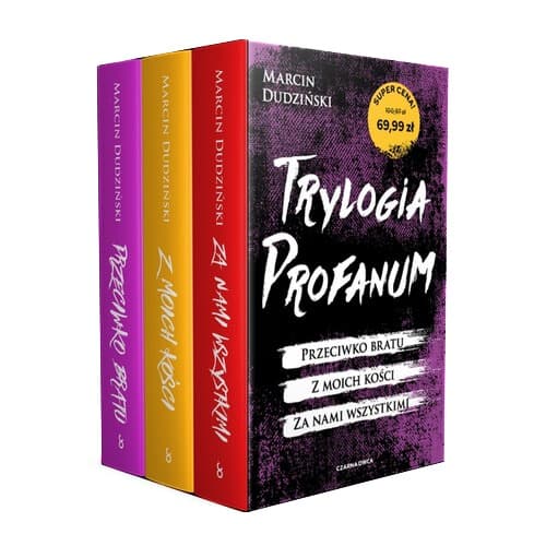 Poznaj mroczne tajemnice Częstochowy! Trylogia Profanum w jednym pakiecie. Przeciwko bratu Mroki Częstochowy wkrótce ujrzą światło dzienne! Biskup Stanisław Walter trzyma w ryzach całe miasto. Jego woli posłuszni są księża, politycy, lokalni biznesmeni i wierni parafianie. Bo kto ośmieliłby się ryzykować utratę łaski? W realizacji planów Walterowi towarzyszy Julian – tajemniczy chłopak o nieznanej nikomu przeszłości, który dla swojego opiekuna zrobi wszystko. Naprawdę wszystko. Gdy w mrokach katedry Stanisław Walter szykuje się do ostatecznego ruchu, jego brat Jerzy, komendant miejski Policji, podejmuje decyzję i wydaje rozkaz. Nie może dłużej udawać, niezależnie od tego, kim się stał – i kim stał się jego brat. Częstochowa od tygodni nie widziała słońca, jakby nadchodził biblijny potop. Mało kto zdaje sobie sprawę, co tak naprawdę nastąpi. Bo już wkrótce brat stanie przeciwko bratu! Z moich kości Nadszedł czas, żeby ukrócić jego męki. Złapał za sznur na jego nogach i mocno pociągnął mężczyznę za sobą. Nie dbał już o to, że porani go szorstki grunt. Teraz zaczynało się najlepsze. Położył związanego człowieka tuż obok dołu. Wyjął nóż i oświetlił go tak, żeby ten mógł zobaczyć szerokie ostrze. Częstochowa. Komendant miejski policji Jerzy Walter musi stawić czoła kryzysowi i własnej przeszłości. Pozornie spokojny czas, który nastąpił po skandalu wokół jego brata, biskupa Stanisława Waltera, przerywa nagła kradzież. Z muzeum archeologicznego ktoś zabiera bezcenne kości. Gdy pierwsza z nich zostaje odnaleziona, policjanci orientują się, że to nie włamanie było ich największym problemem. Mając w pamięci groźbę brata, Jerzy Walter zaczyna podejrzewać, że wszystko, co właśnie ma miejsce, zostało przygotowane w określonym celu… Gdy komendant próbuje odnaleźć mordercę i ukryć swoją przeszłość, zamknięty w areszcie Stanisław przygotowuje swój kolejny ruch. Niezależnie od tego, co zrobił jego brat, Walter zamierza przypomnieć mu, że nie sposób odwracać się od rodziny i przyjaciół. Częstochowa jeszcze nigdy nie doświadczyła tak gorącego lata. Oślepieni słońcem mieszkańcy chowają się przed żarem z nieba i złem, które ich otacza. Mało kto wie, że kości, z których powstało, zostały zakopane dawno temu. Za nami wszystkimi Częstochowie wciąż nie dane jest zaznać spokoju. Mimo skandalu i wcześniejszych zarzutów biskup Stanisław Walter wciąż pociąga za sznurki. Jego brat, komendant miejski policji Jerzy Walter, zniknął bez śladu, a wraz z nim brutalna tajemnica jego przeszłości. Na wolności wciąż pozostaje również seryjny morderca, który terroryzował miasto w upalne lato. W targanej żywiołami Częstochowie krzyżują się losy osób, które próbują powstrzymać panoszące się tam zło. Marek Marczuk chce za wszelką cenę odnaleźć Jerzego i powstrzymać zabójcę. Prokurator Edyta Lichota stara się prowadzić śledztwo w atmosferze coraz większych politycznych nacisków. Alicja Drylska na przekór wszystkiemu wraca do rodzinnego miasta, by ostatecznie rozprawić się z biskupem Walterem. Żadne z nich nie wie, co ich czeka. Dni są coraz krótsze, ciemność ogarnia wszystko. Czy Częstochowa odrodzi się na nowo?