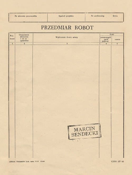 "Przedmiar robót" Marcina Sendeckiego to intensywna, precyzyjna, po inżyniersku ścisła książka poetycka, w której szuka się miary wiersza i mierzy z jego bezmiarem. Przedmiar robót to procedura, która dotyczy zarówno budowy, jak rozbiórki – wiersza i życia. To dokument, który poprzedza i projektuje przyszłe prace, a jednocześnie wystawia rachunek przeszłości. "Przedmiar robót" to pomiar i wyznanie wiary. "Wiersz jest zrozumiały / Wiersz jest niezrozumiały" – pisze autor. "Przedmiar robót", "zrozumiały" czy "niezrozumiały", mówi przede wszystkim o tym, że "wiersz jest".