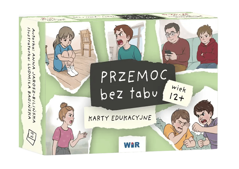 Przemoc bez tabu to karty edukacyjne o przemocy dla młodzieży 12+. Pomagają rozpoznawać przemoc fizyczną, psychiczną, seksualną, zaniedbanie oraz cyberprzemoc. Zestaw łączy jasno zdefiniowane kategorie przemocy z ilustrowanymi scenkami z życia nastolatków.