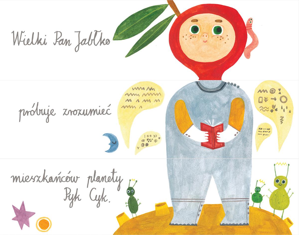 Pomysłowa książka przekładanka dla wszystkich miłośników radosnego pomieszania z poplątaniem. Są sympatyczni, kolorowi i troszkę dziwaczni. A gdy ruszą w taniec przeplataniec, wszystko może się zdarzyć. Poznajcie Przeplatalińskich! Patrzcie tylko! Pomysłowy Albert zjada z apetytem skarpety na bal. Wesoły Jasiek prasuje leniwego kota. A Wielki Pan Jabłko próbuje zrozumieć swoje brudne kolana… W tej książce każda strona – i każda postać – podzielona jest na trzy części. Przewracajcie je w dowolnych kombinacjach, by bohaterowie wymieniali się głowami, brzuchami i nogami i wykonywali najbardziej absurdalne czynności na świecie!