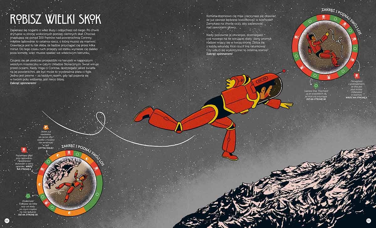 Od decyzji, jaką podejmiesz, zależą Twoje dalsze przygody i fabuła książki. Jeśli nie wiesz, co robić, użyj spinera dołączonego do książki i zdaj się na los!