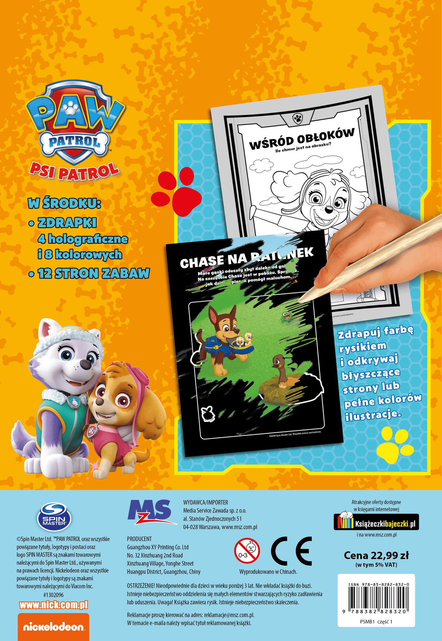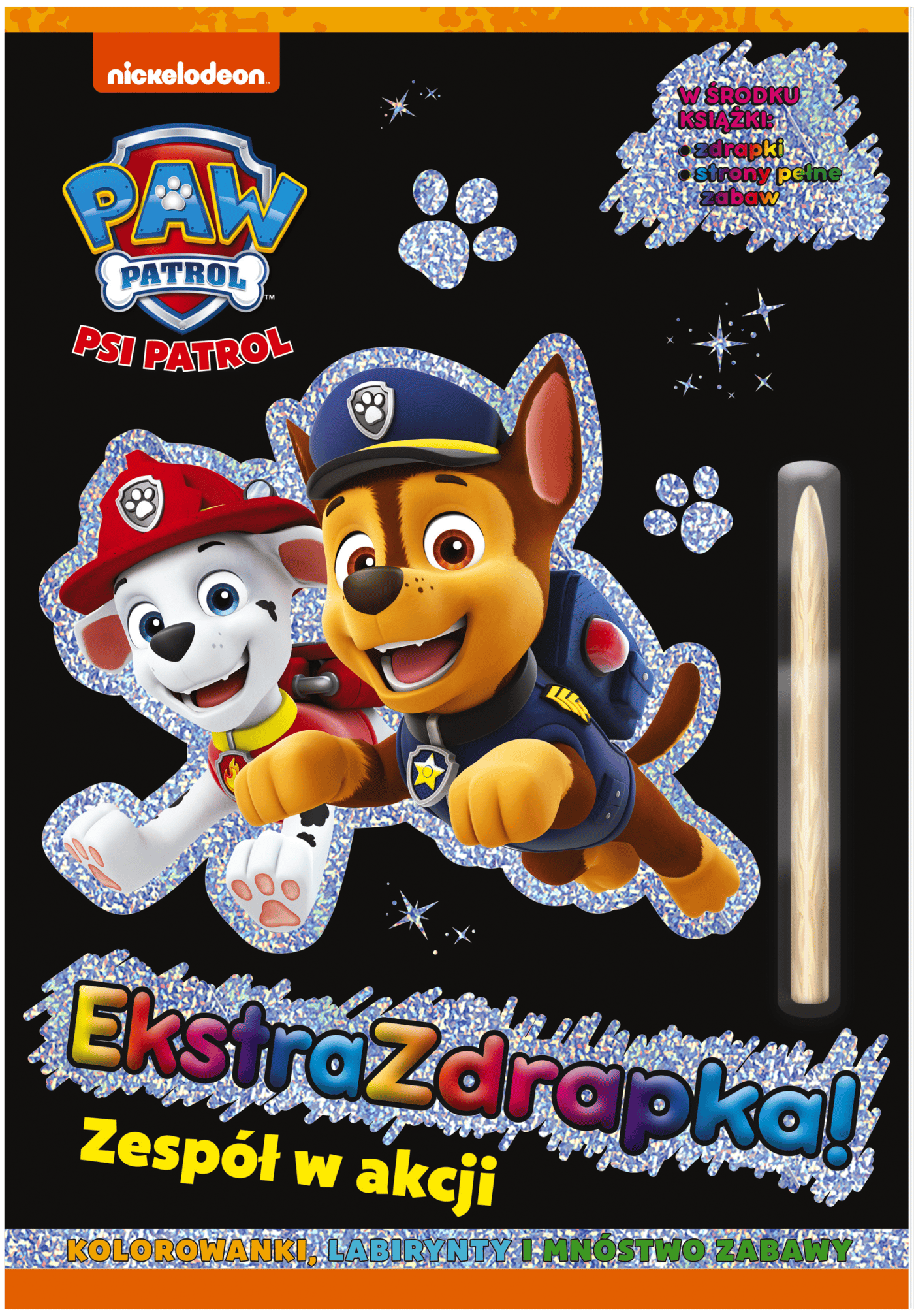 Psi Patrol. Ekstrazdrapka to atrakcyjna książka wspomagająca zdolności manualne u dzieci. Zawiera kolorowanki, labirynty, kolorowe strony do zdrapywania oraz rysik. Wystarczy rysikiem zdrapać farbę, aby pojawiły się błyszczące obrazki lub wielobarwne ilustracje z dzielnymi pieskami.