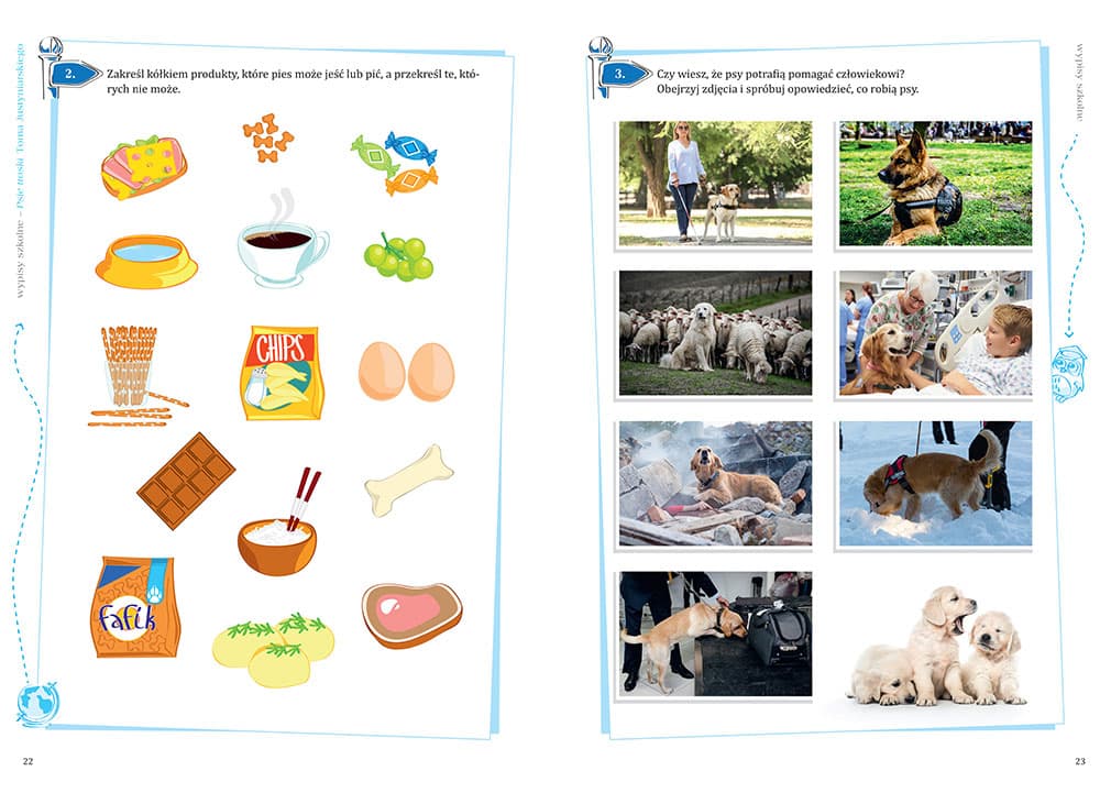 karty pracy – różnorodne zadania dotyczące psów, ich relacji z ludźmi i opieki nad nimi.