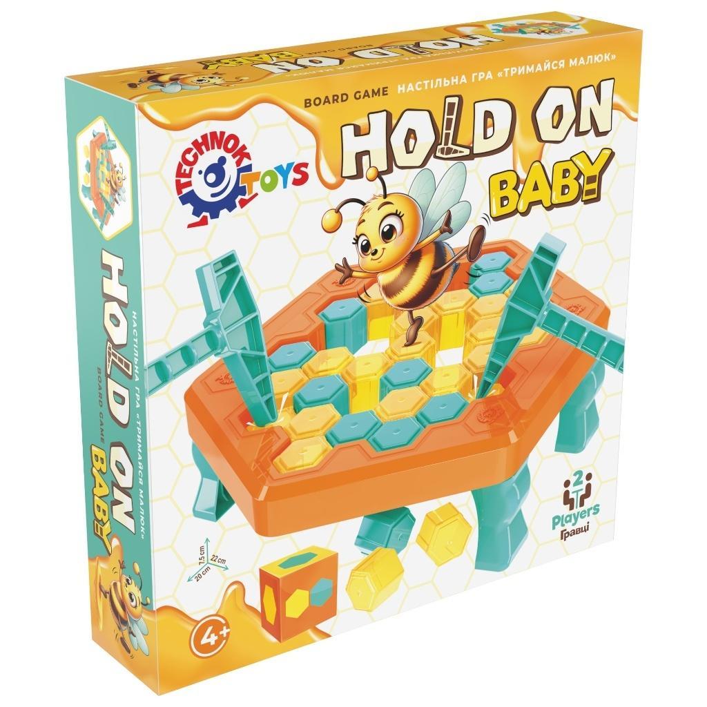 Gra planszowa "Hold on Baby" składa się z pola bazowego, nóg, młotków, figurki "pszczoły", żetonów, kostki i instrukcji kolorów. W sumie jest 46 elementów.