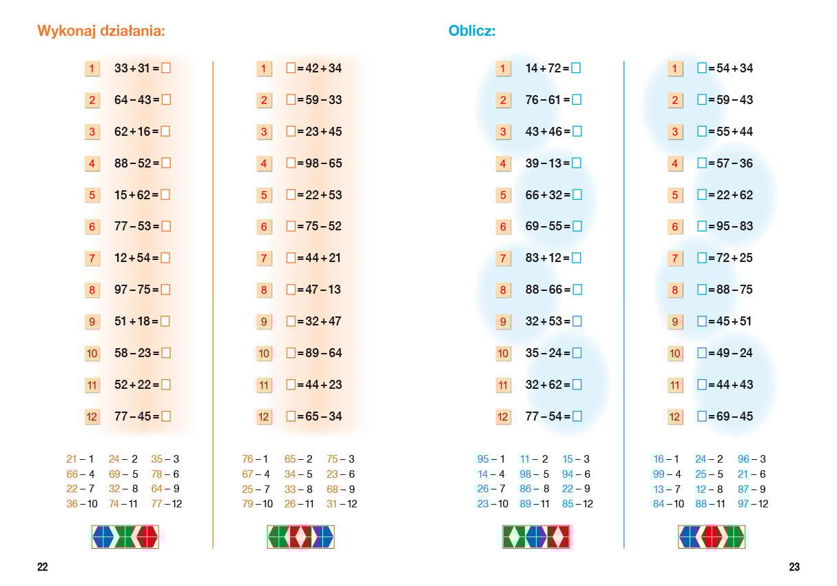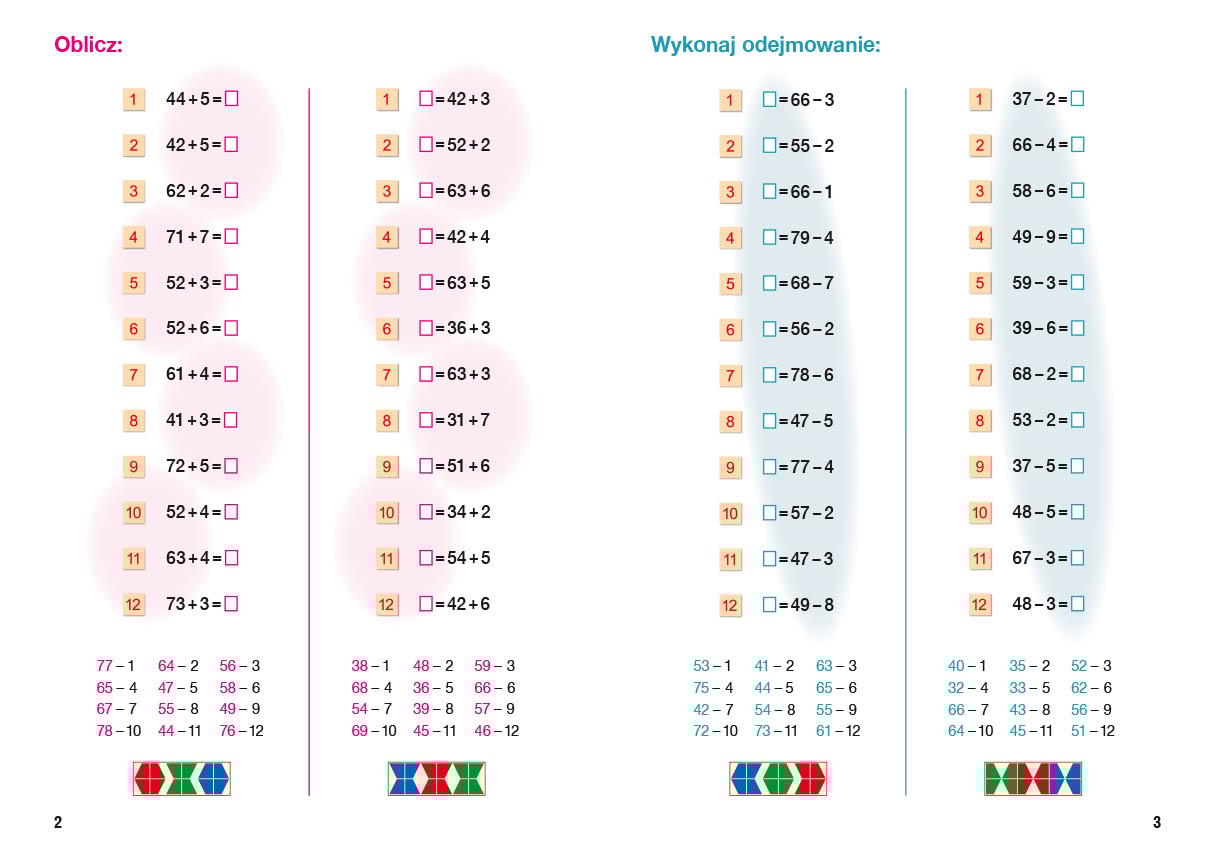 Książeczki z serii Liczę w pamięci to bogaty zbiór zadań dotyczących czterech podstawowych działań arytmetycznych, które swoją przystępną i zabawową formą służą poznawaniu podstaw techniki rachunkowej, utrwaleniu pojęcia liczby oraz doskonaleniu umiejętności symbolicznego zapisu działań.